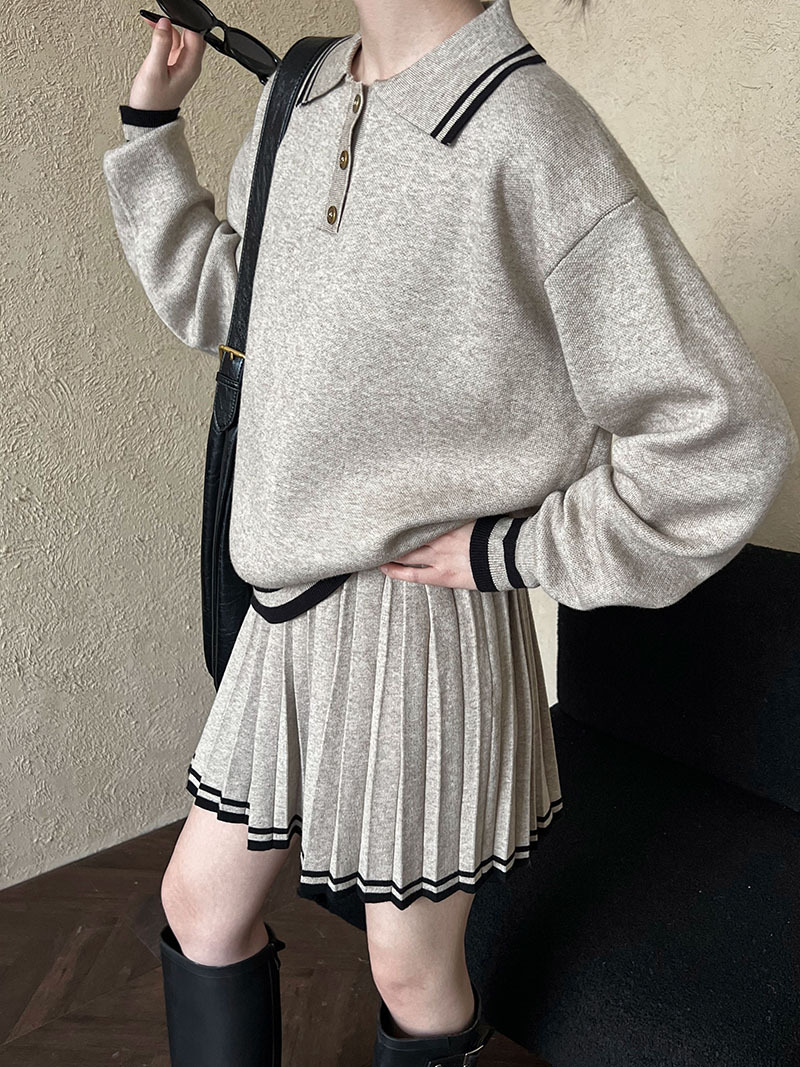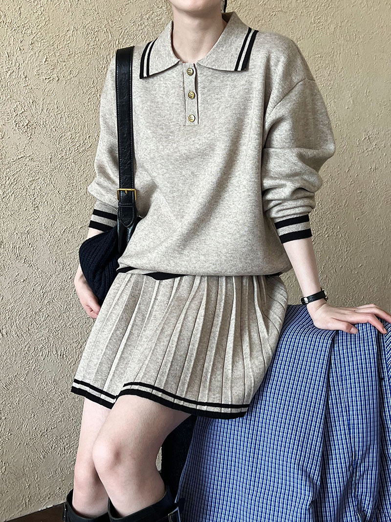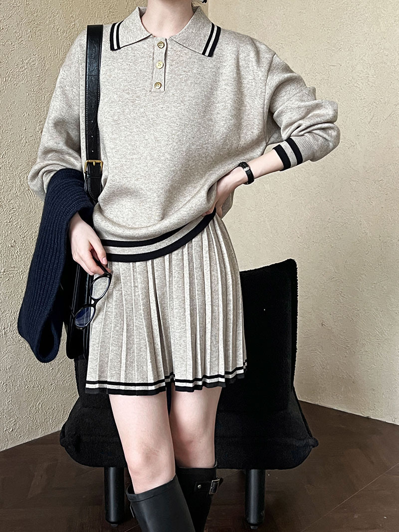 學院風polo領衛衣+高腰百褶半身短裙-兩件式套裝