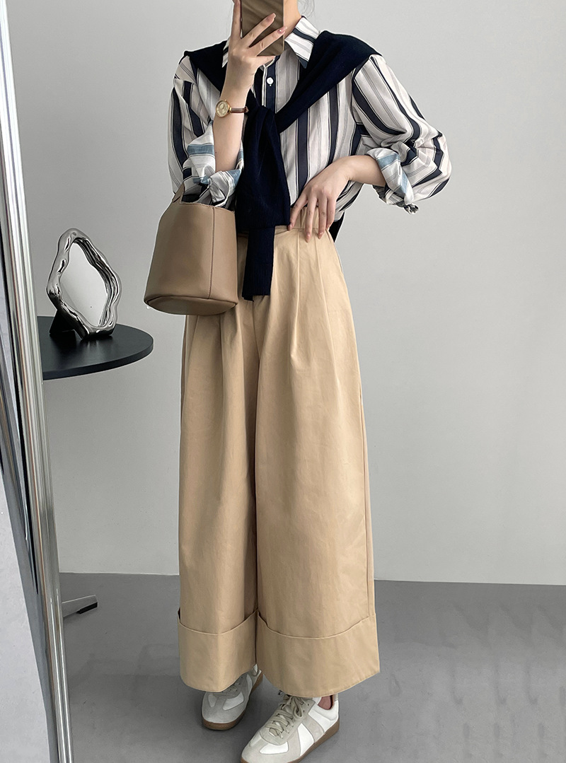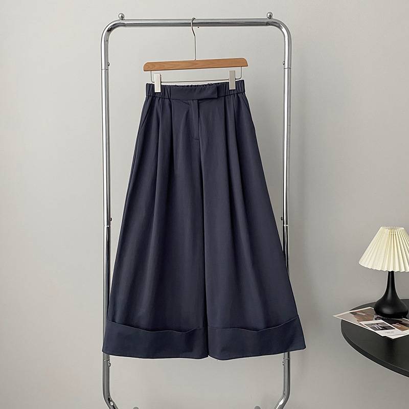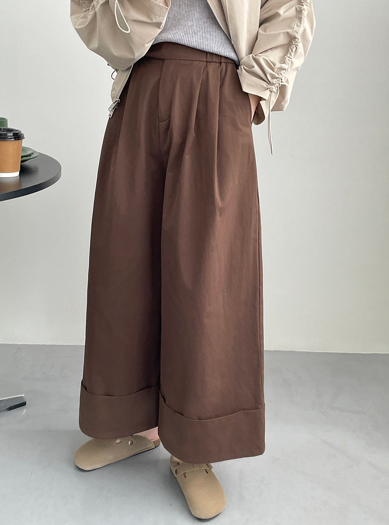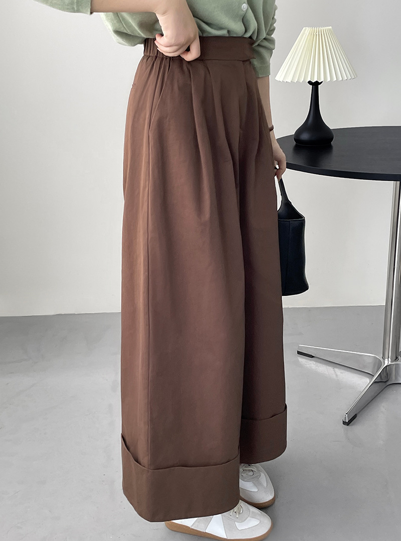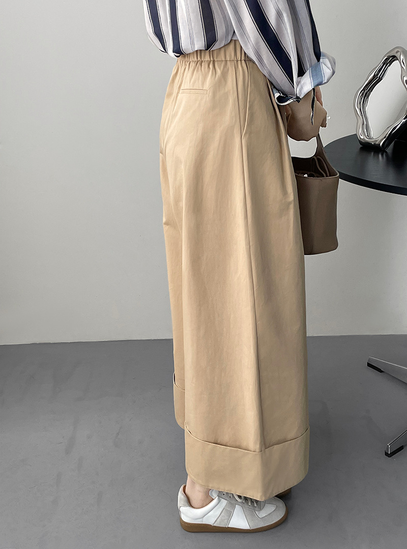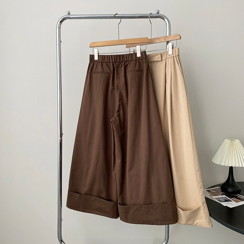 日系顯瘦捲邊鬆緊高腰闊腿褲-3色