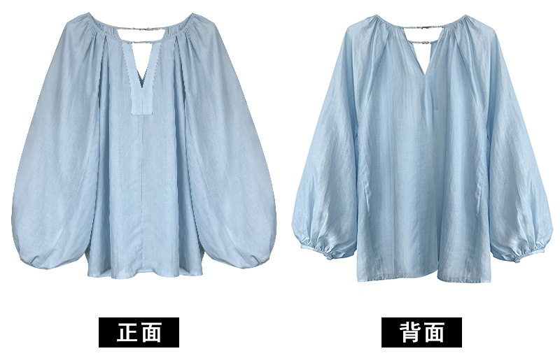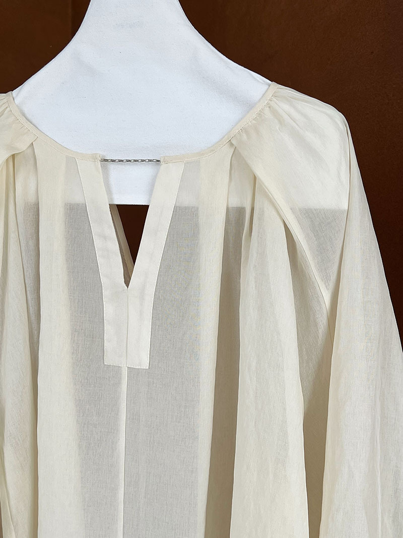 法式雙V領條設計燈籠袖微透防曬襯衫-3色
