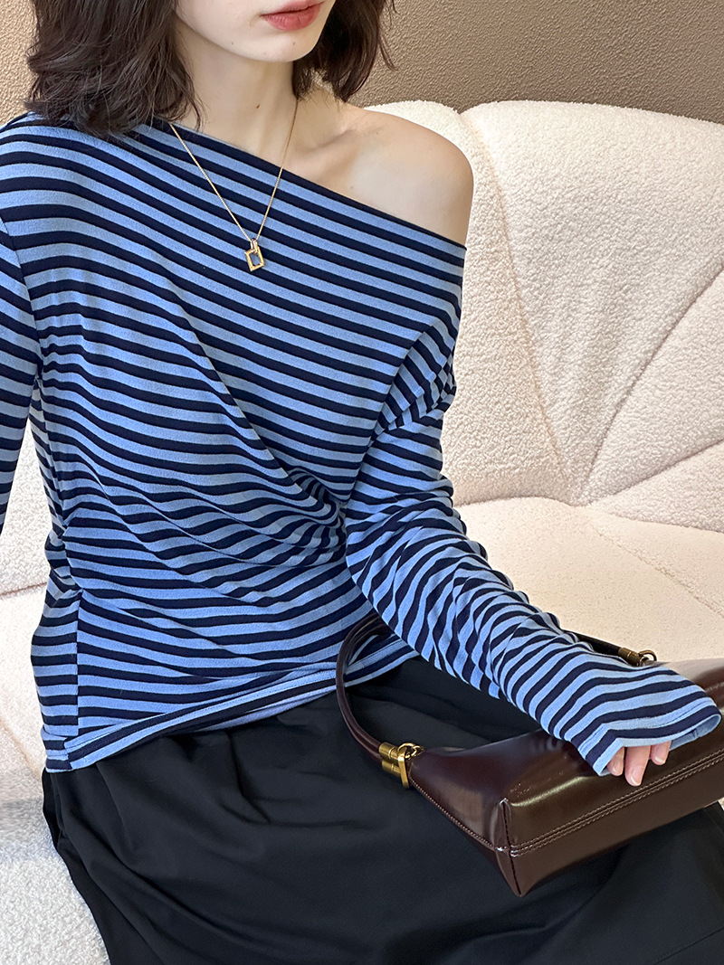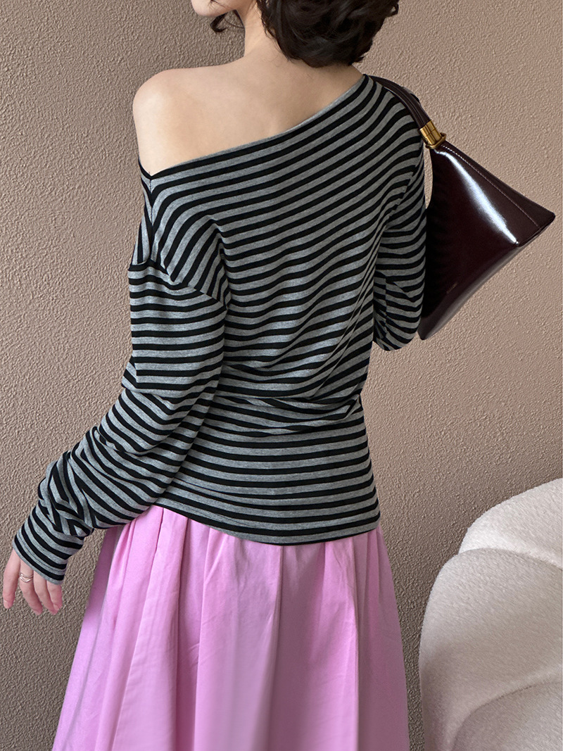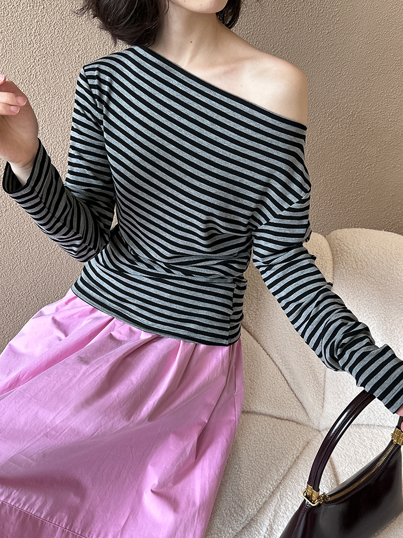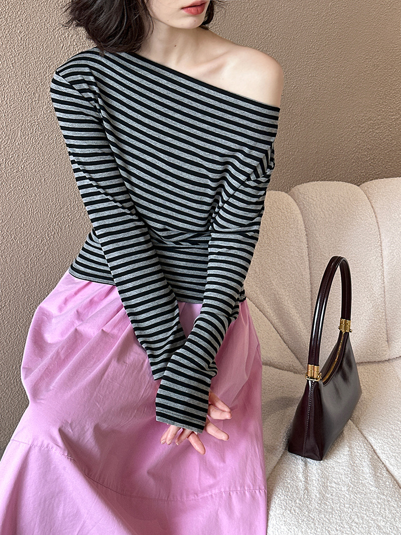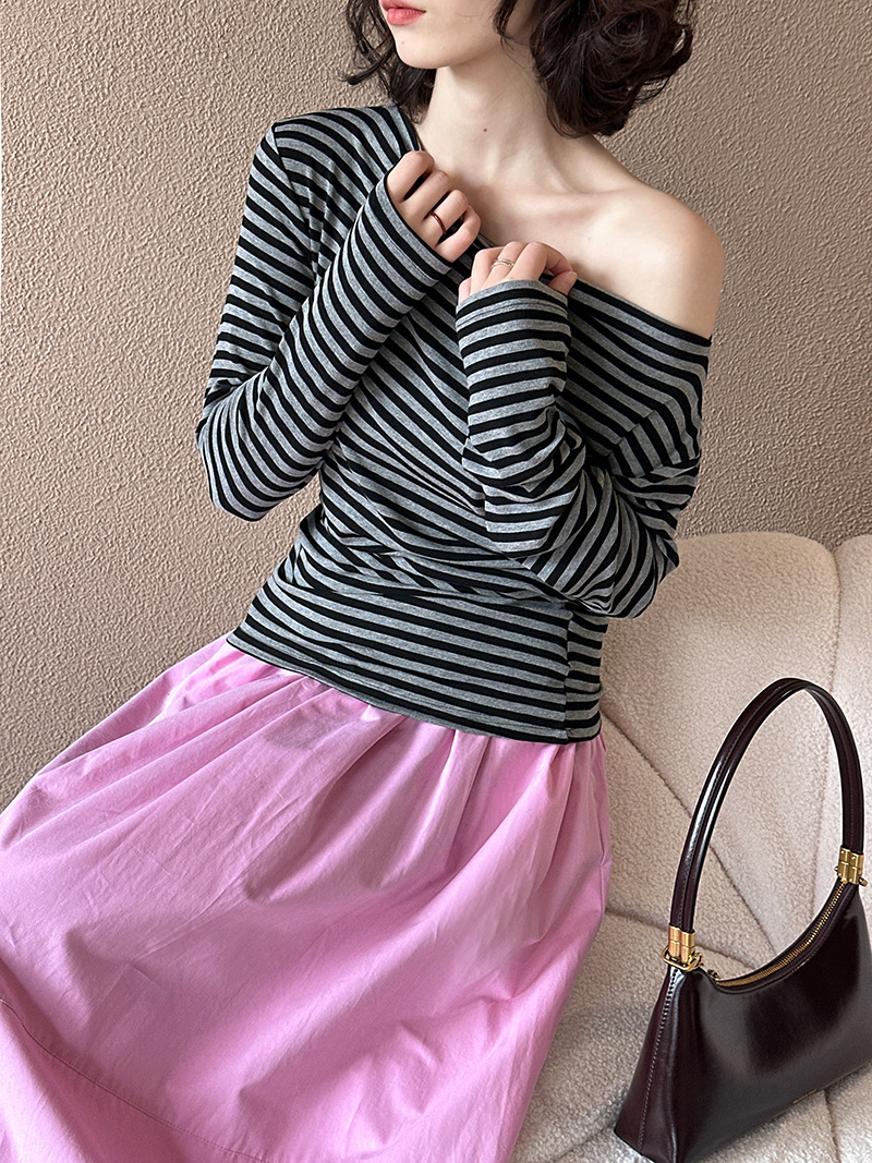 美式復古性感條紋修身露肩T恤-2色
