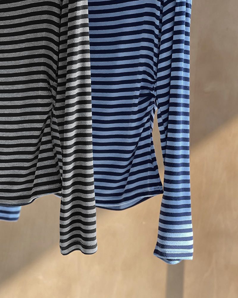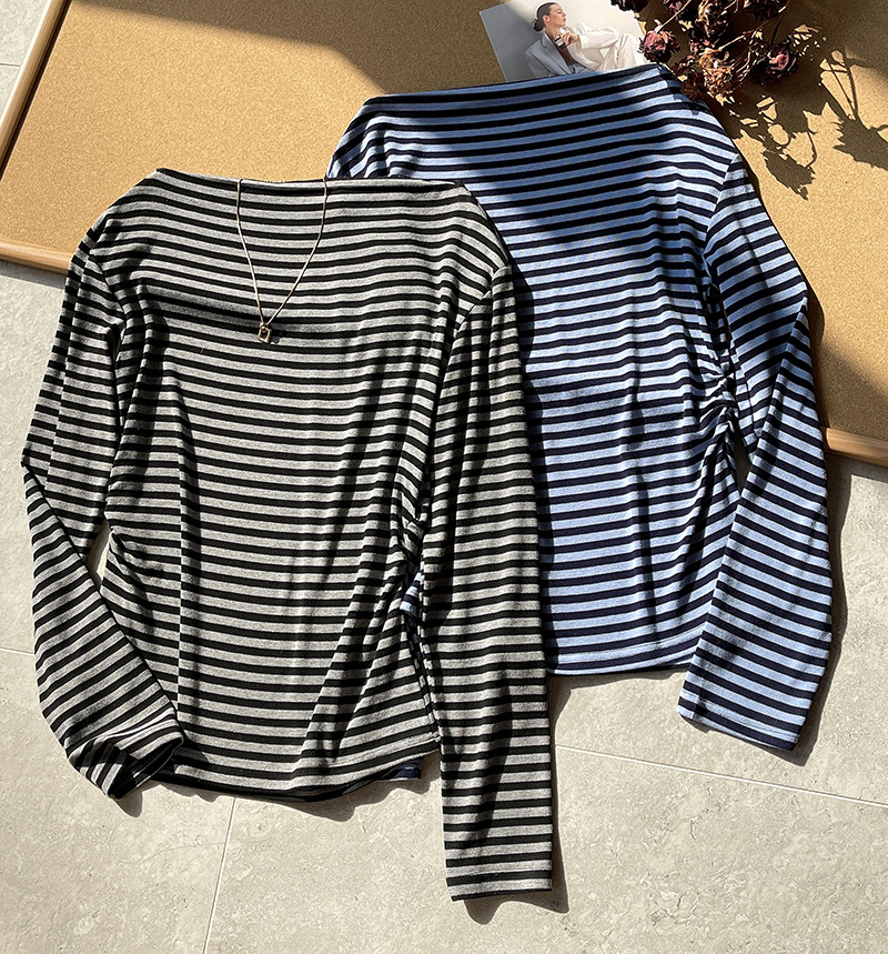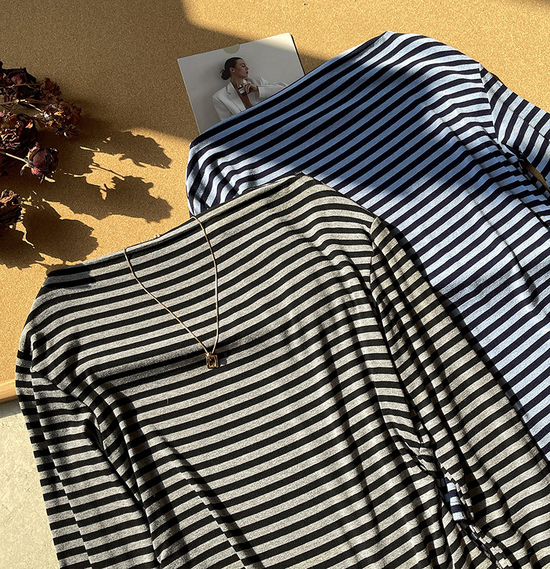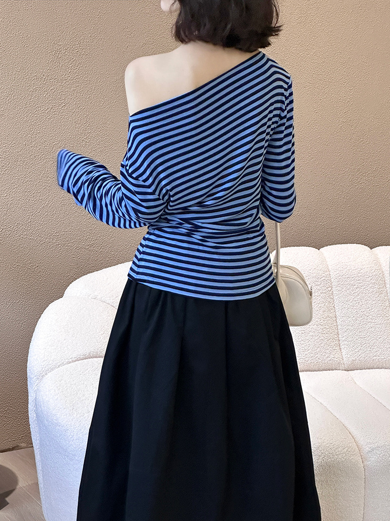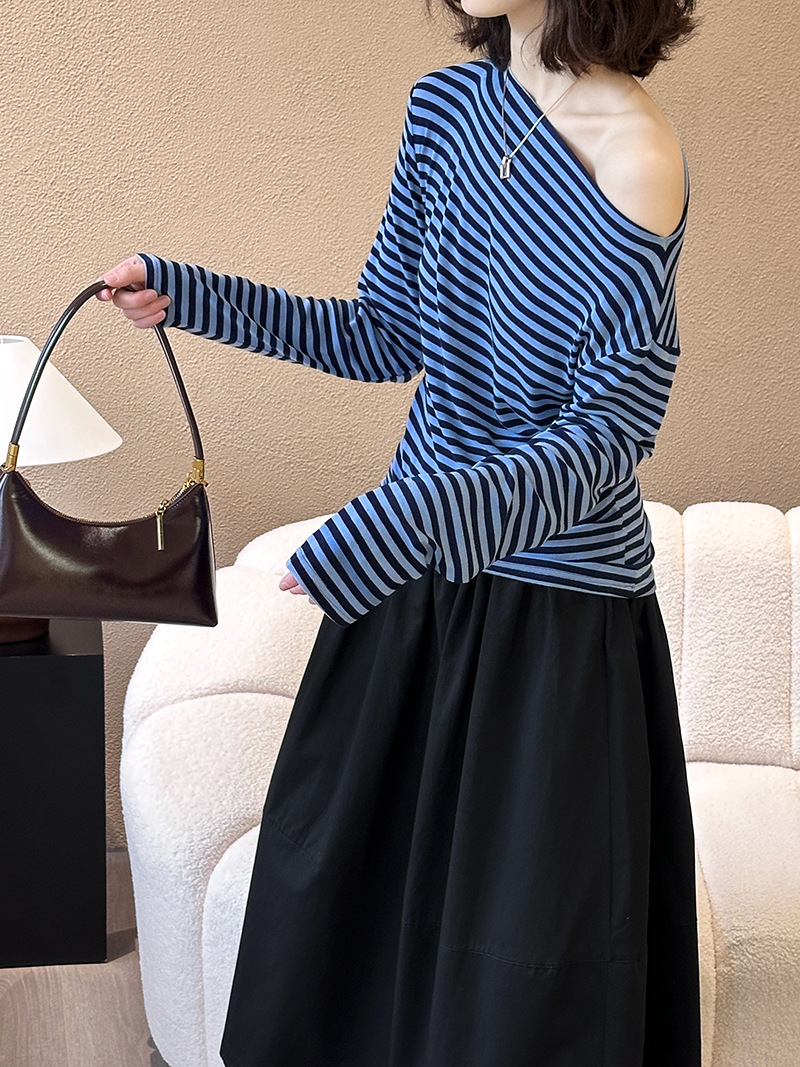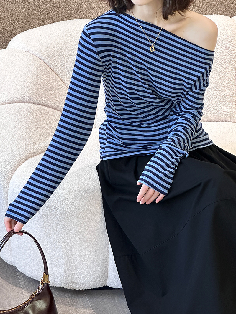 美式復古性感條紋修身露肩T恤-2色