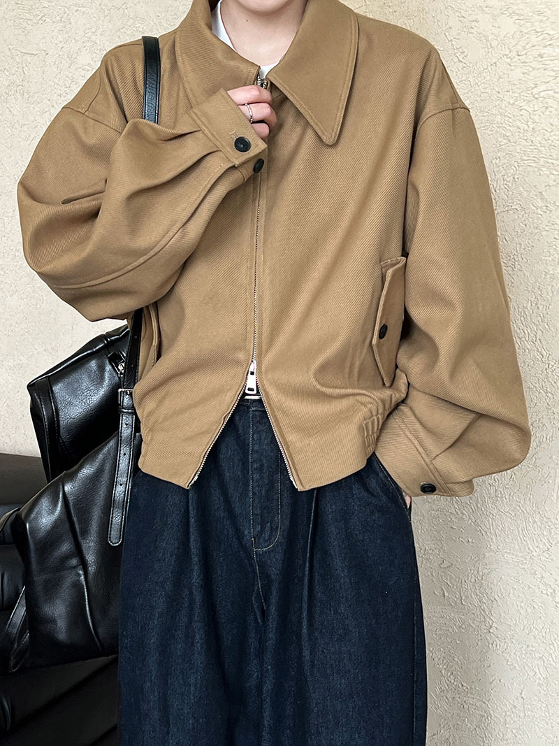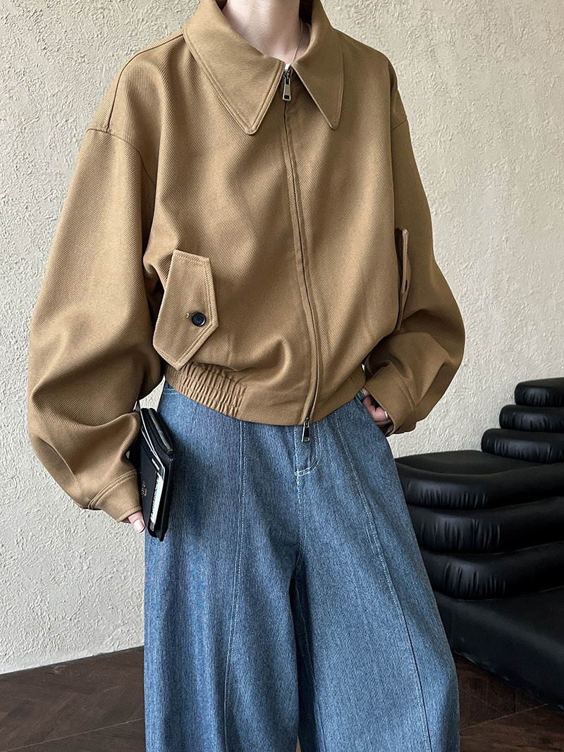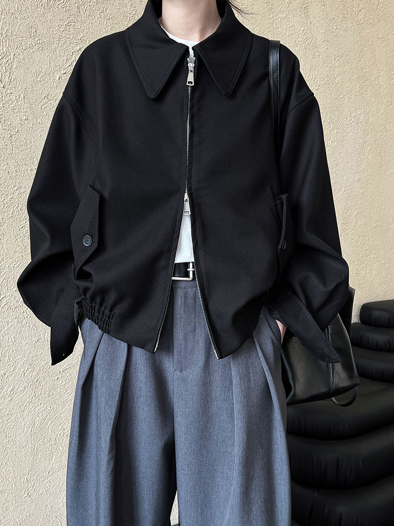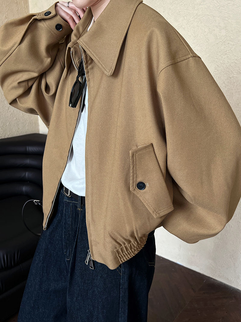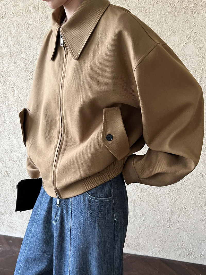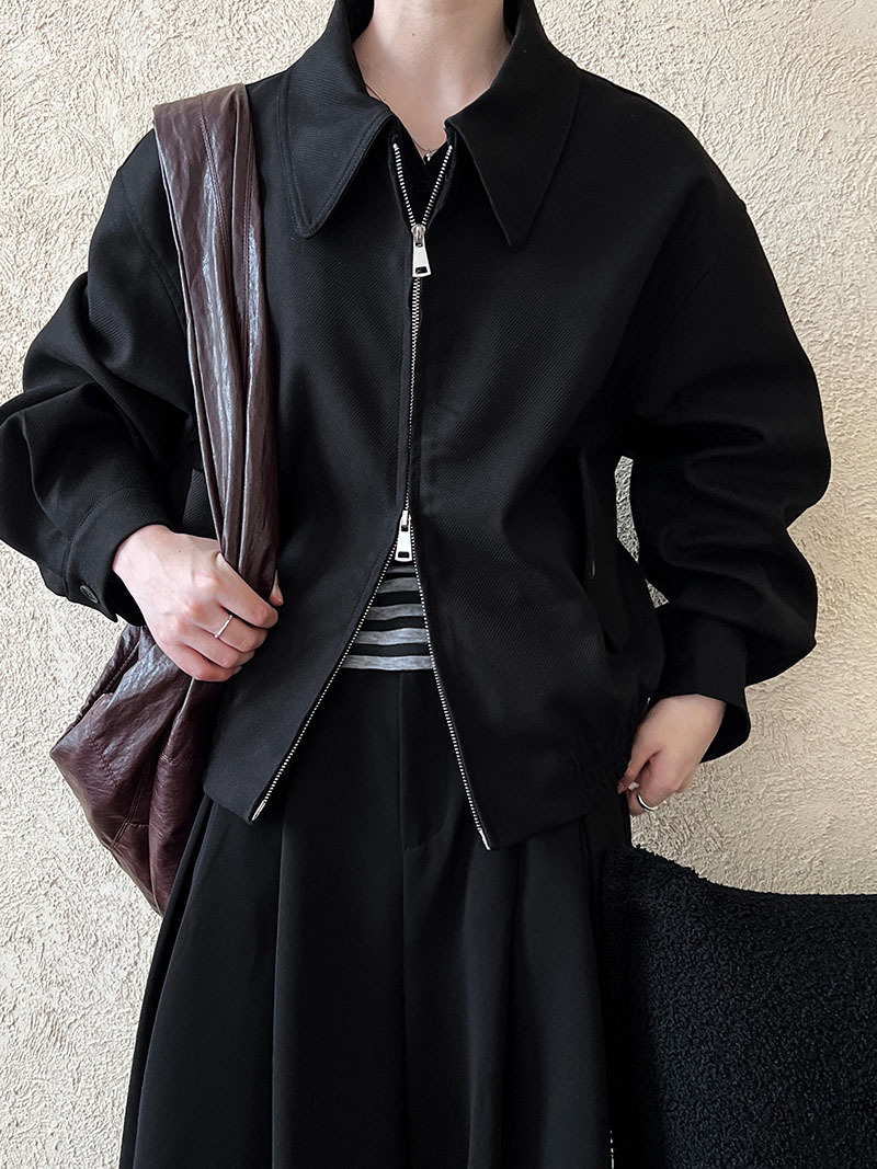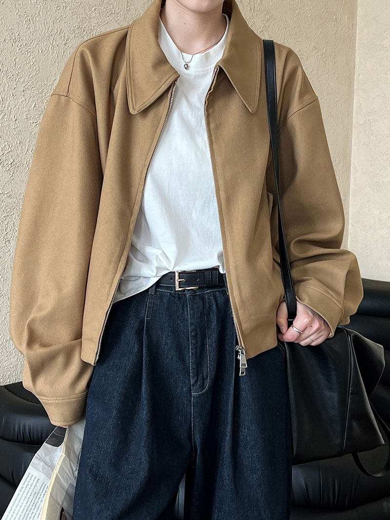 美拉德翻領落肩拉鍊長袖夾克外套-2色