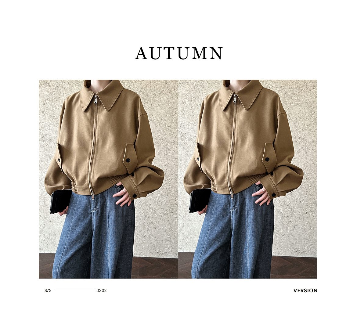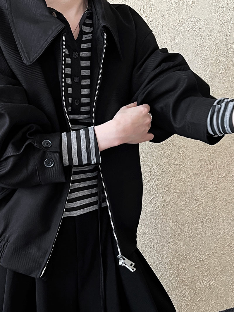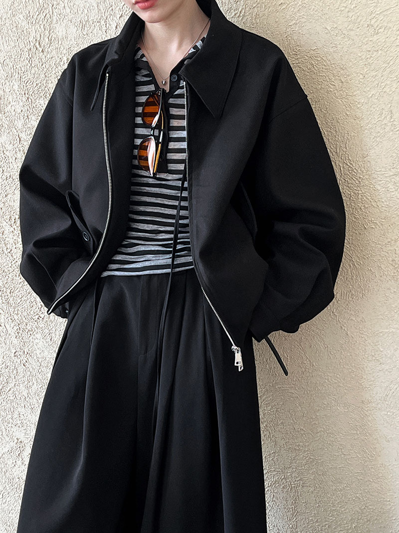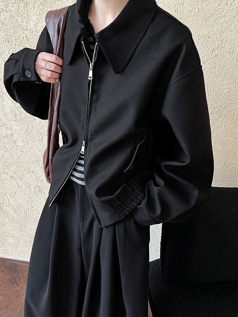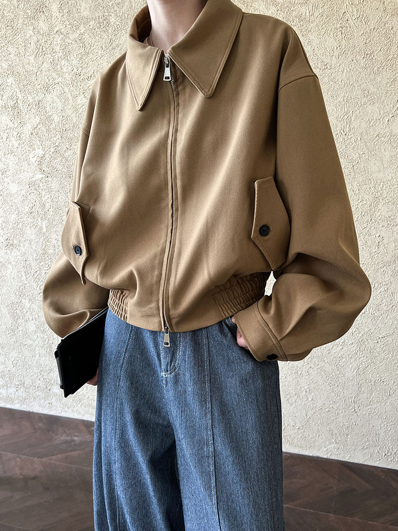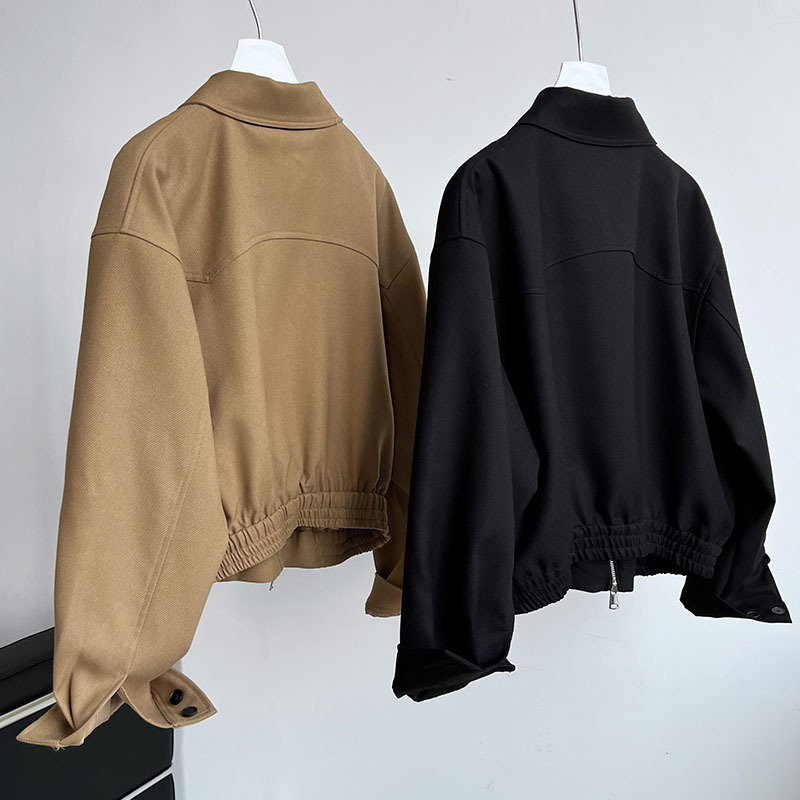 美拉德翻領落肩拉鍊長袖夾克外套-2色