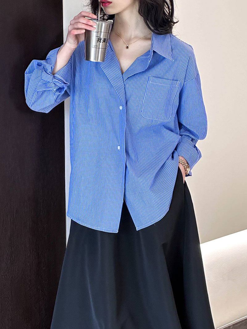 藍色條紋韓系氣質寬鬆設計感高級襯衫
