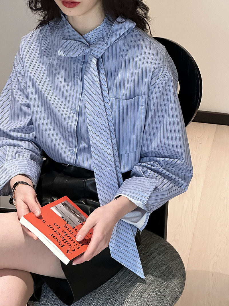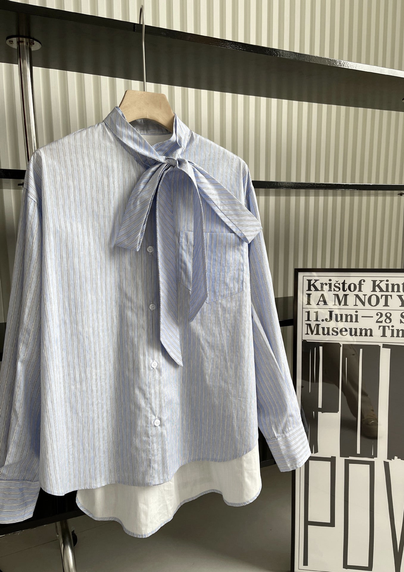 藍蝴蝶條紋綁帶寬鬆襯衫