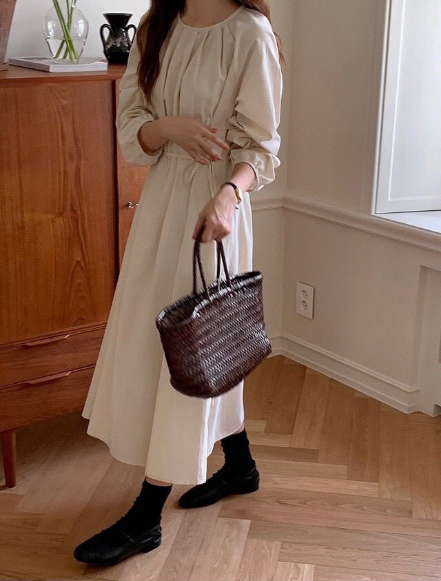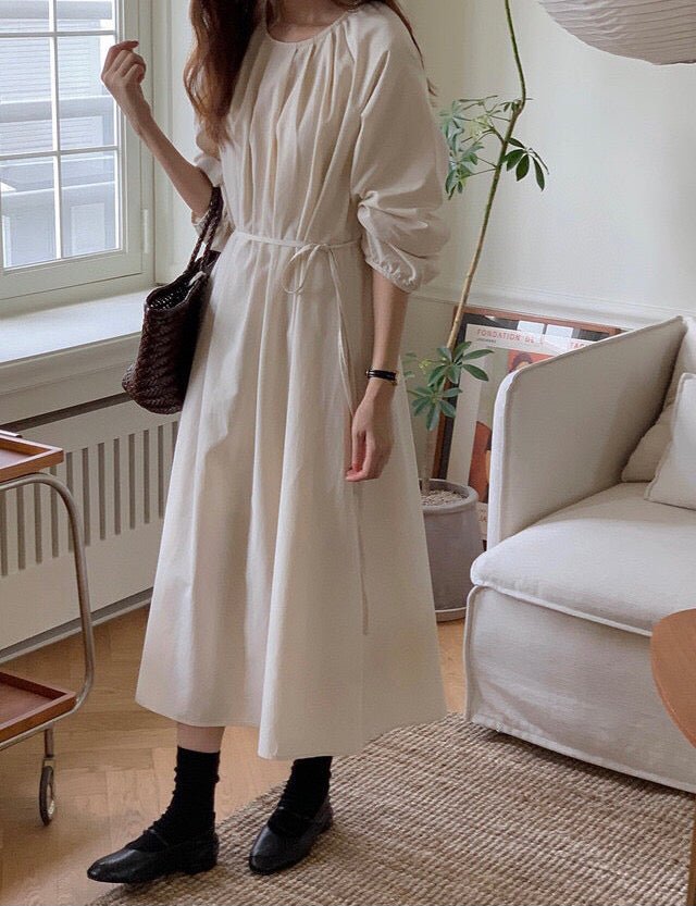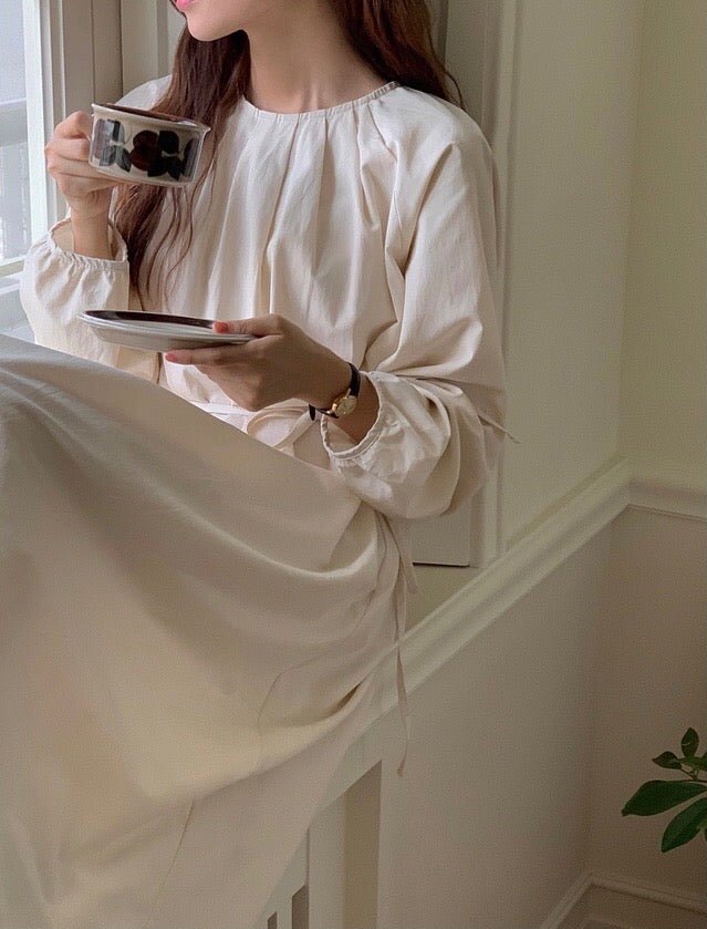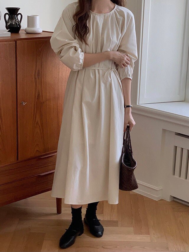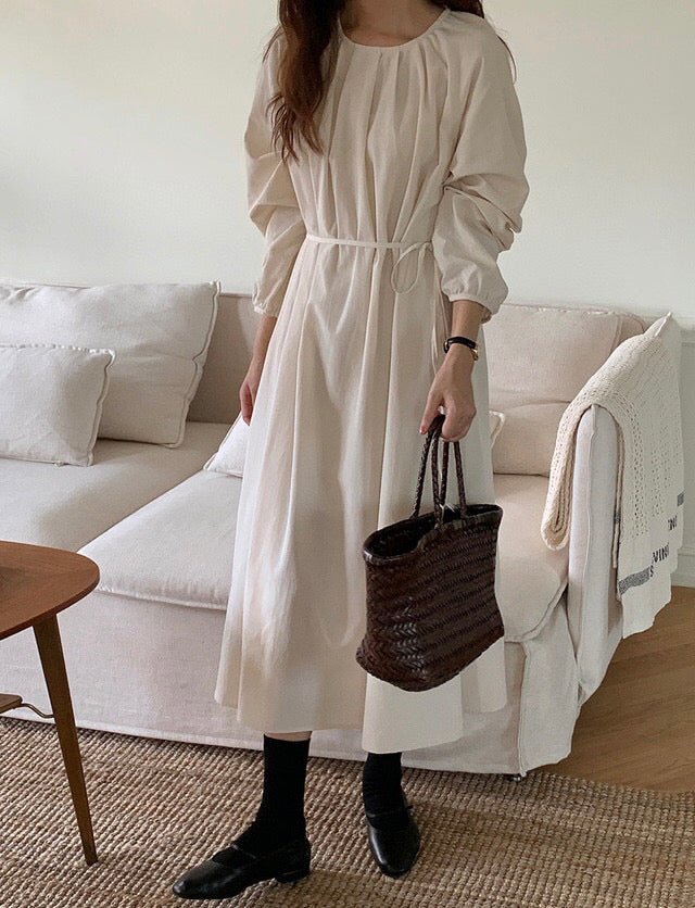 韓系氣質繫帶長袖連身裙 - Moon Peach