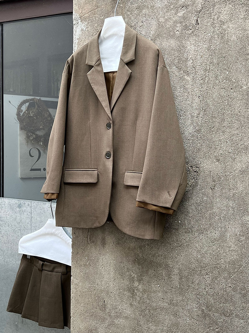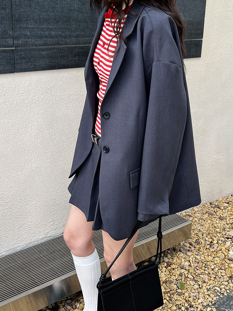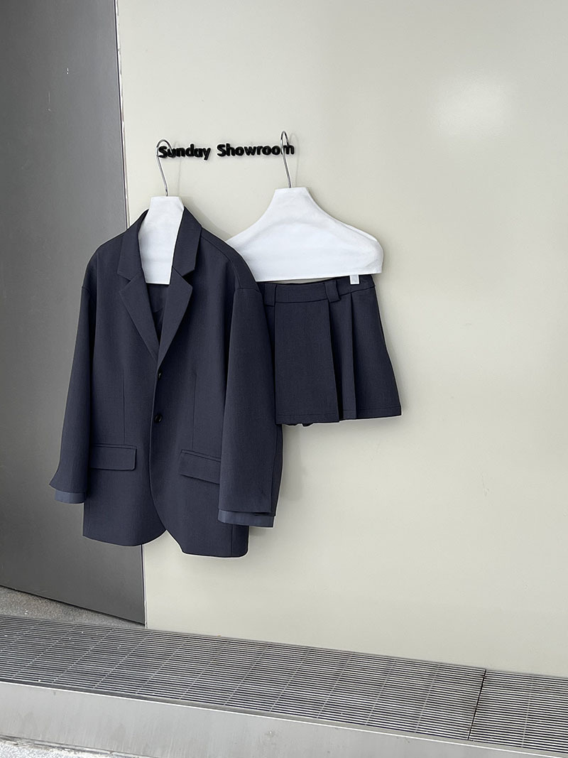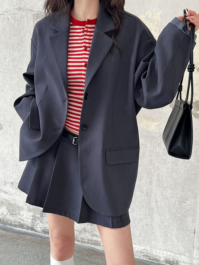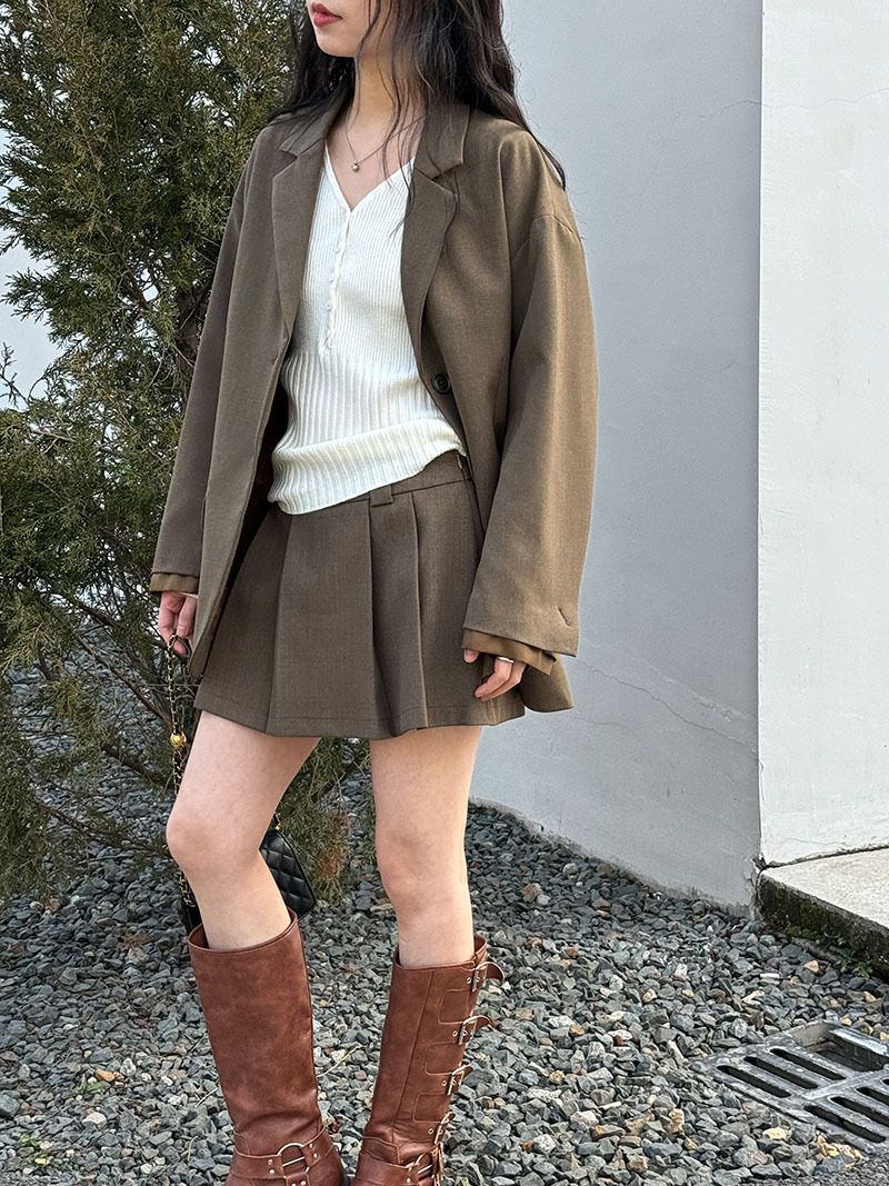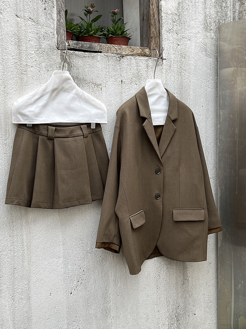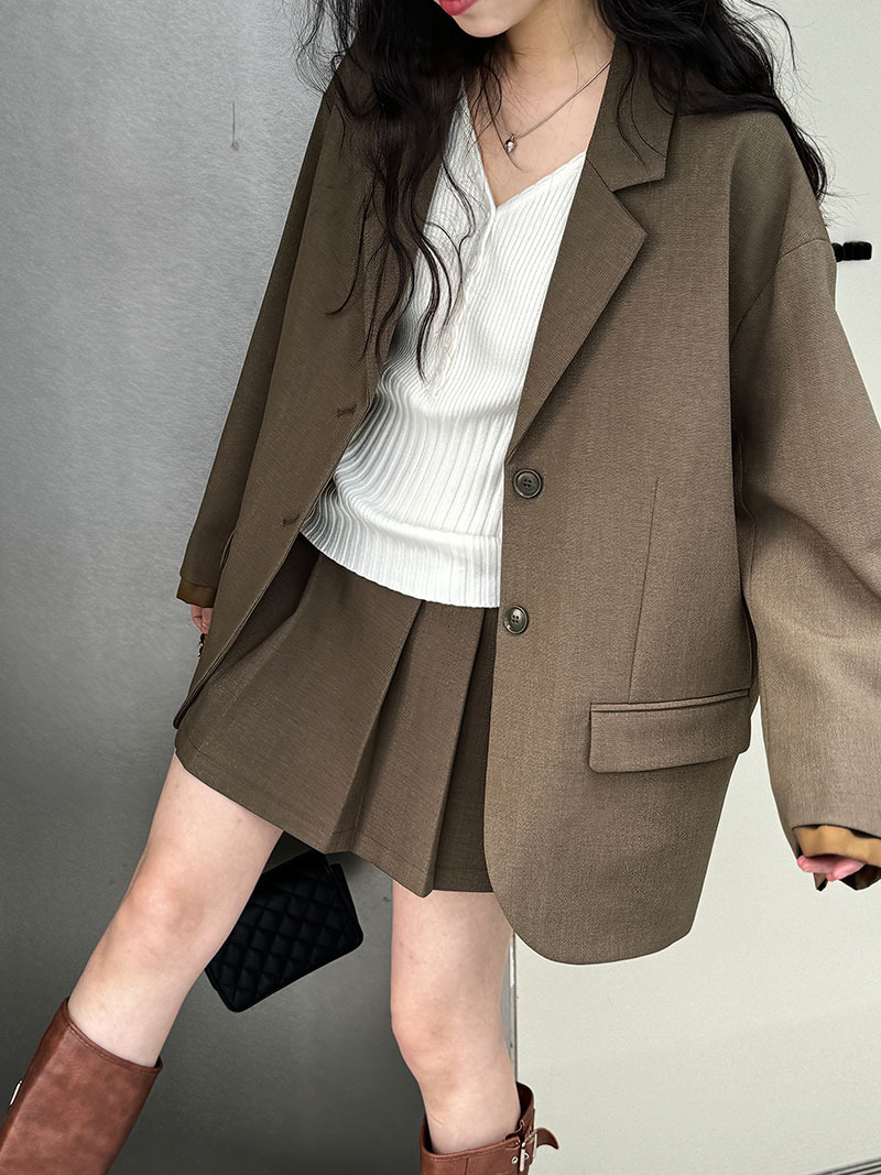 韓系高級感休閒袖口拼接西裝外套+百褶半身裙兩件式套裝-2色