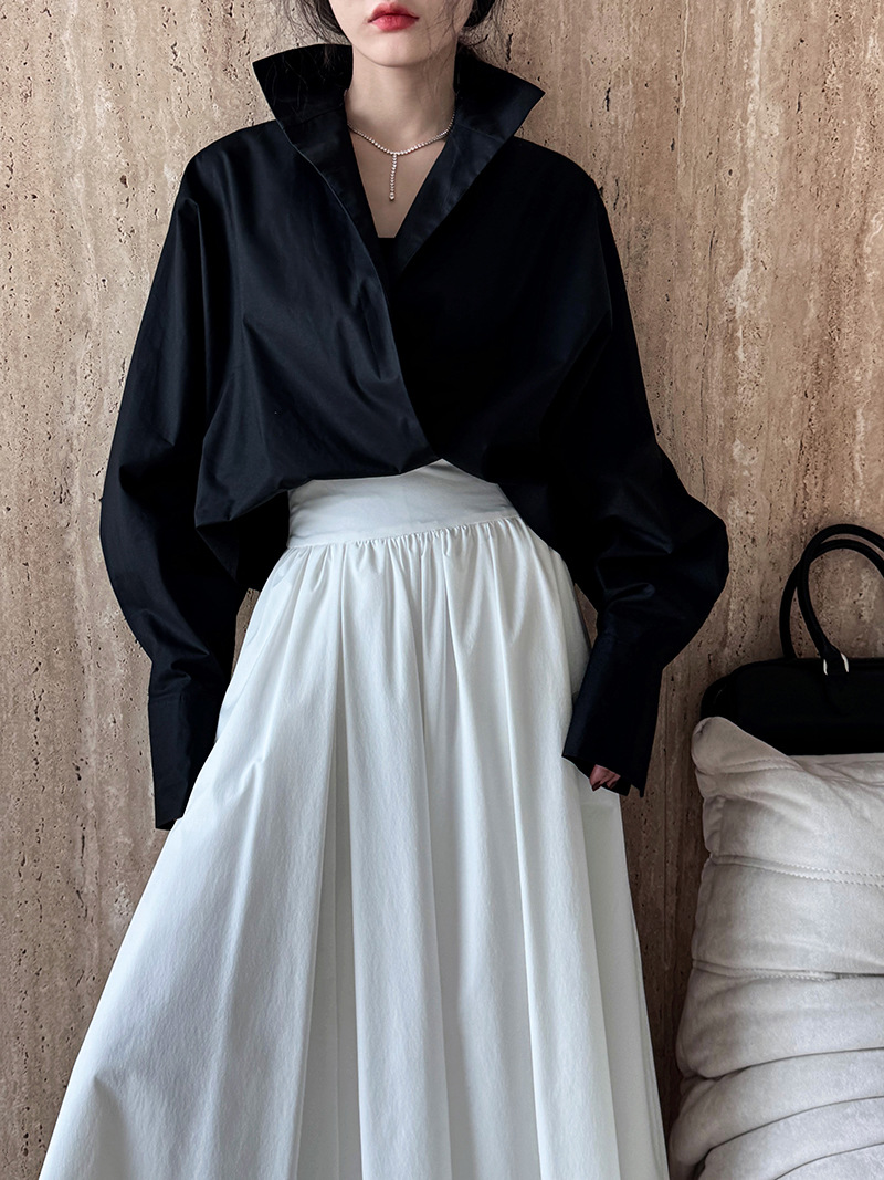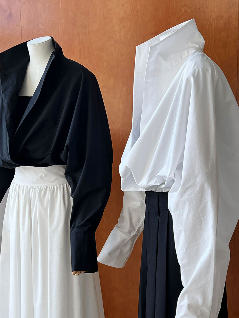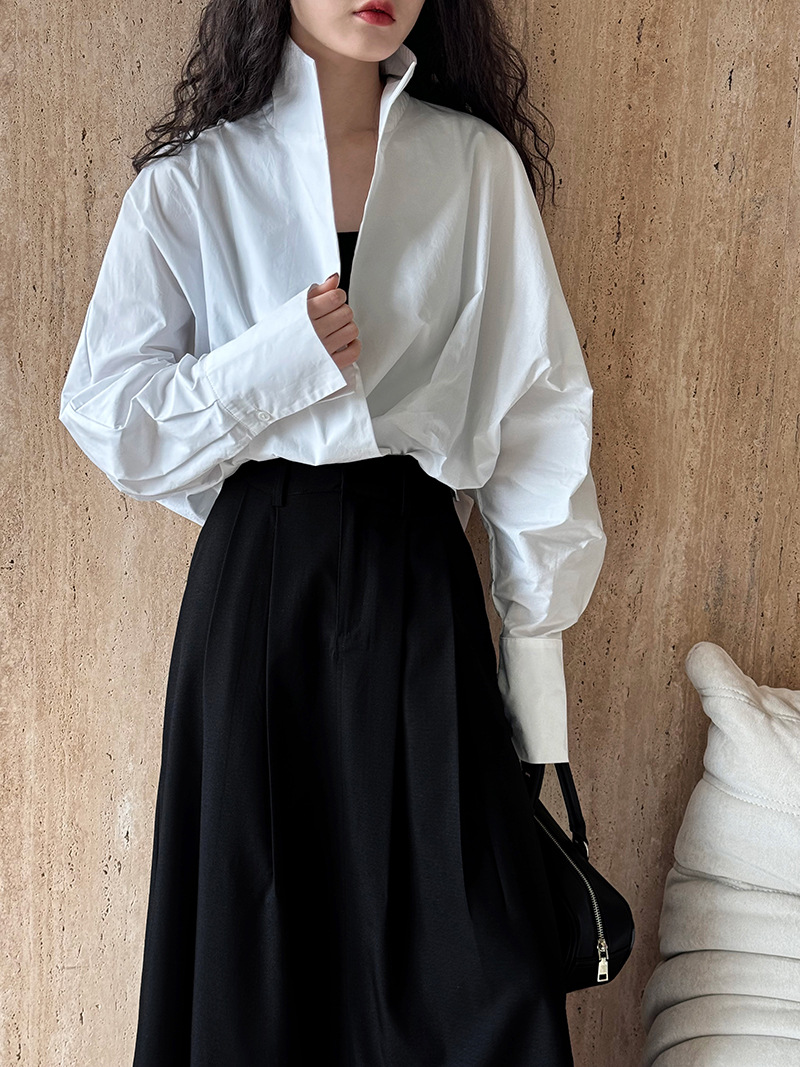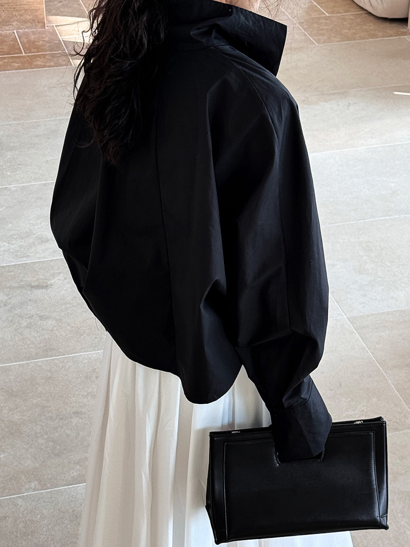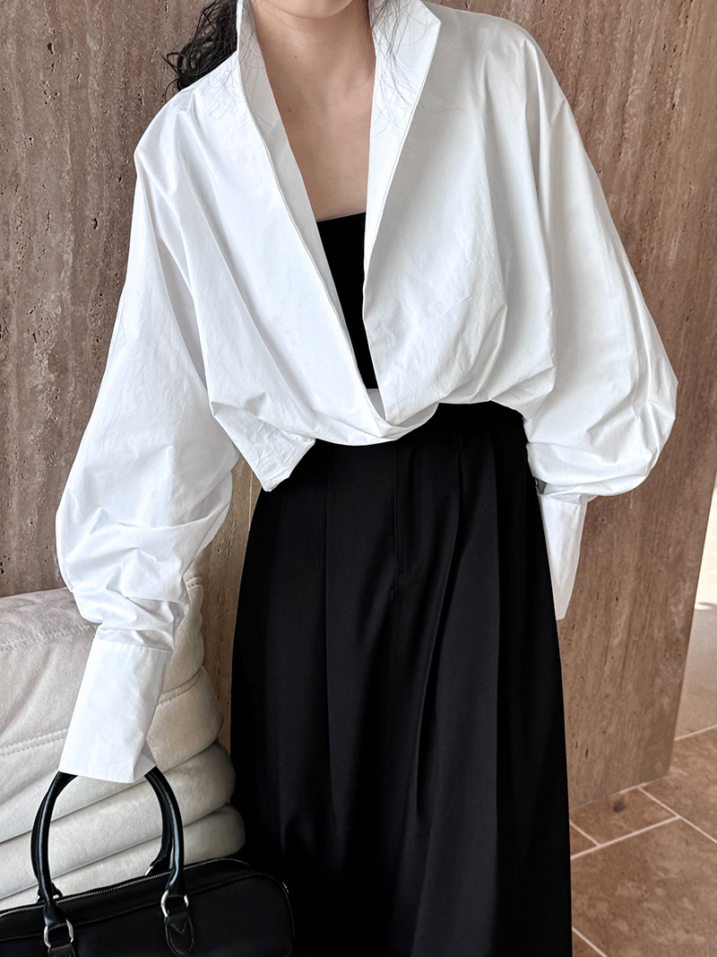 廓形疊穿蝙蝠袖深V立領襯衫-2色