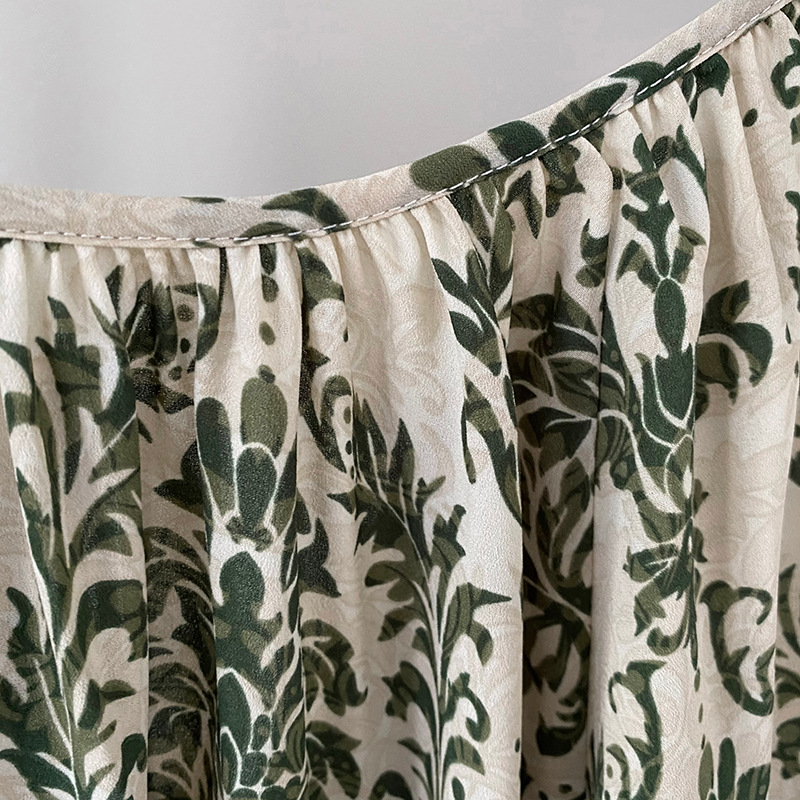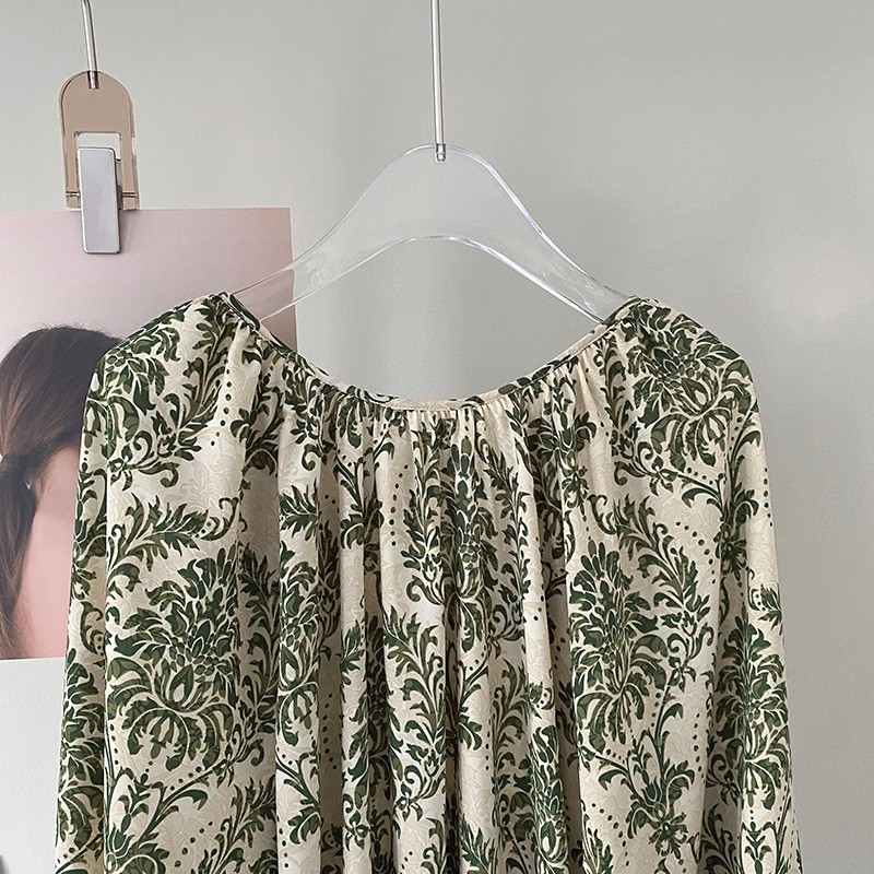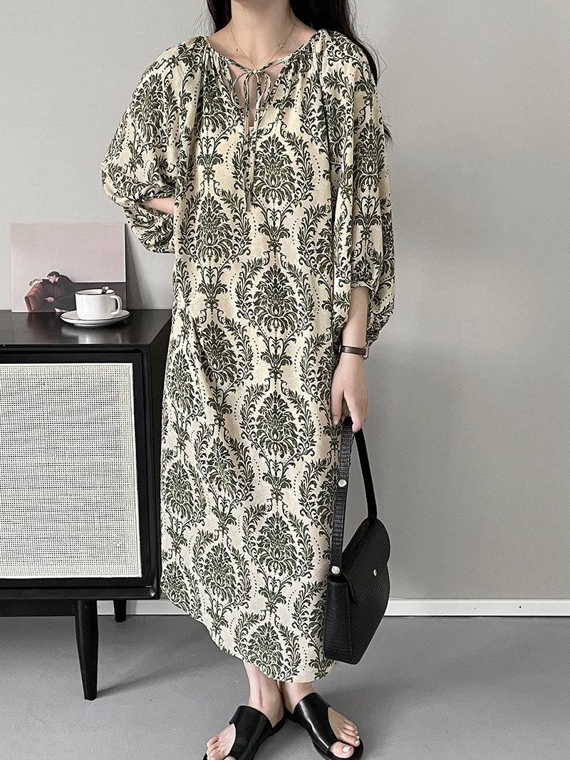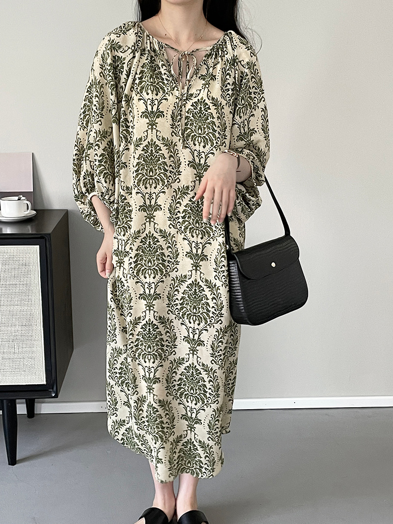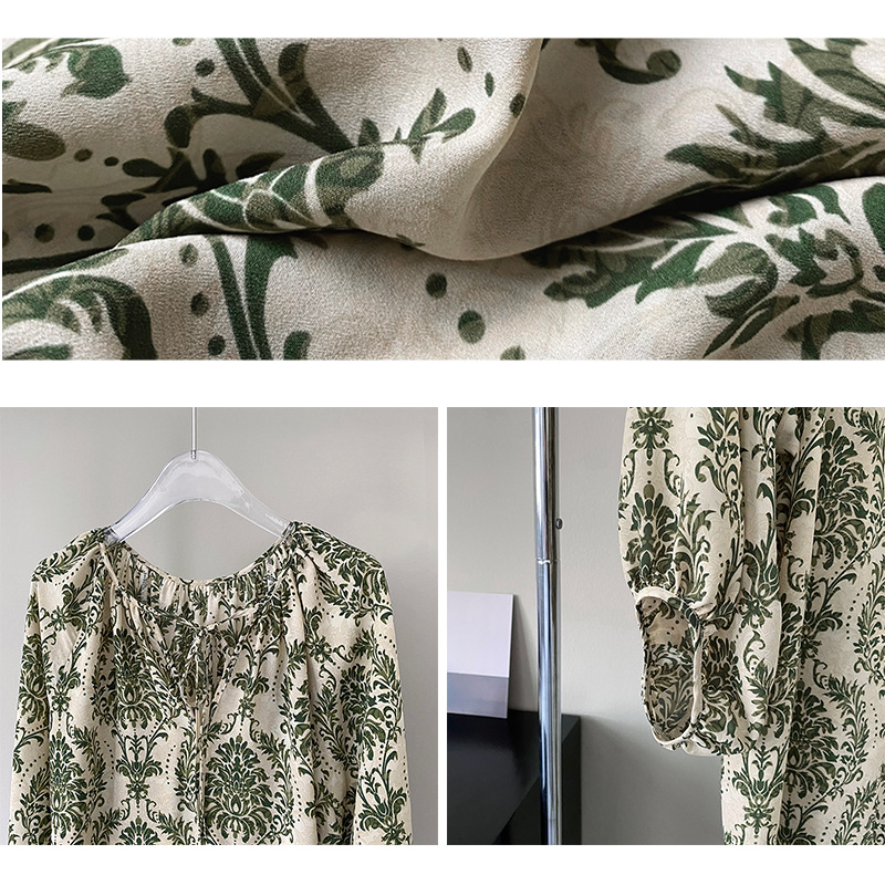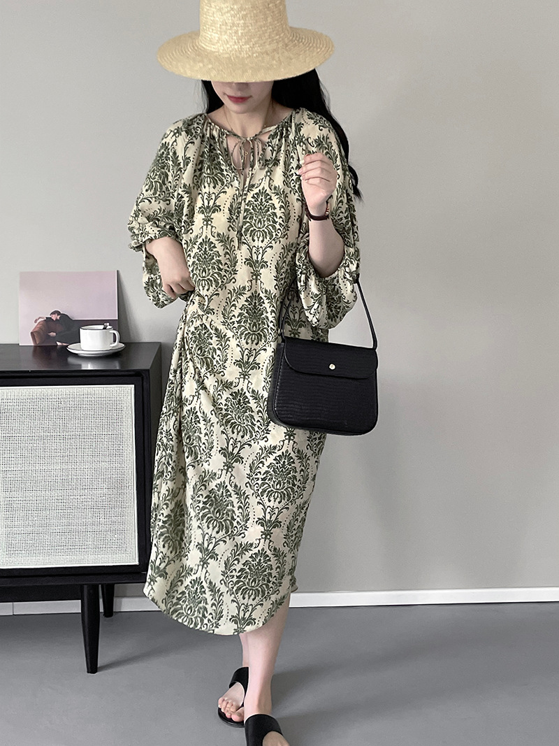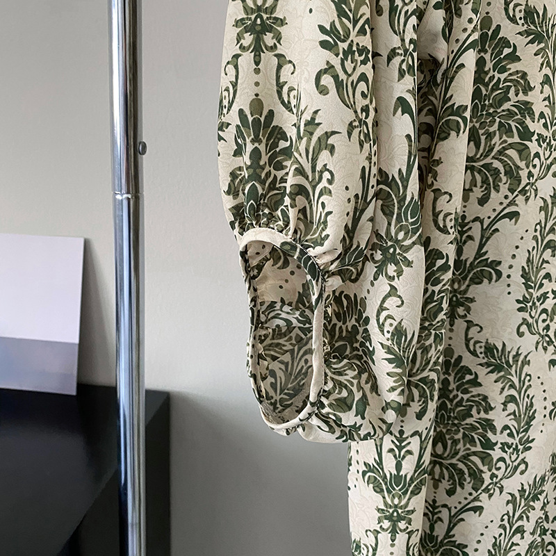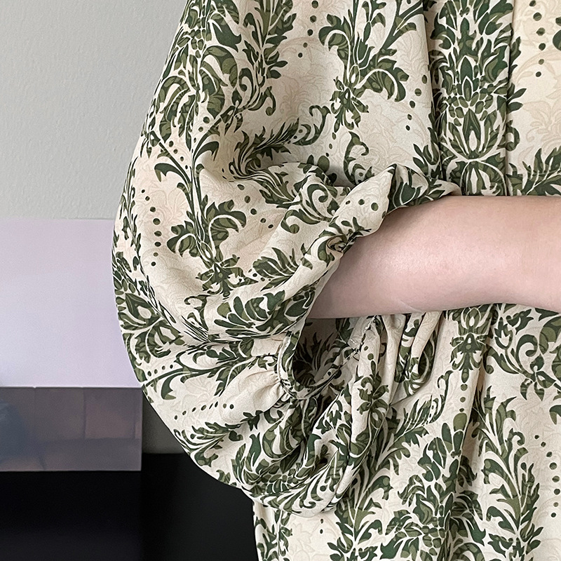 (48H出貨)復古綠碎花燈籠袖薄款連身裙