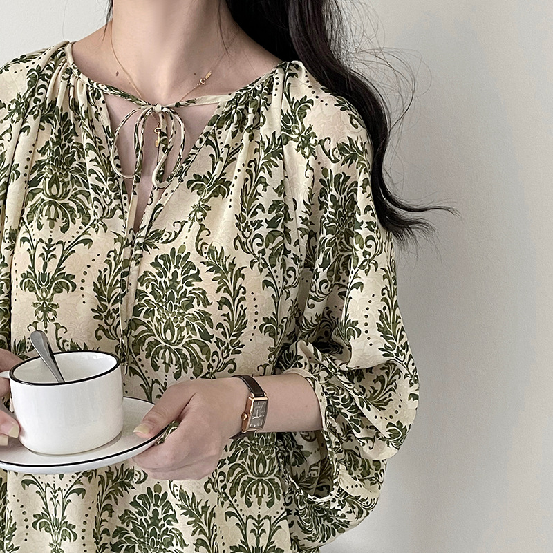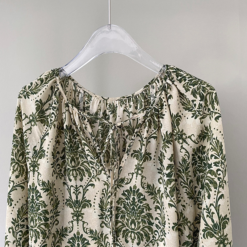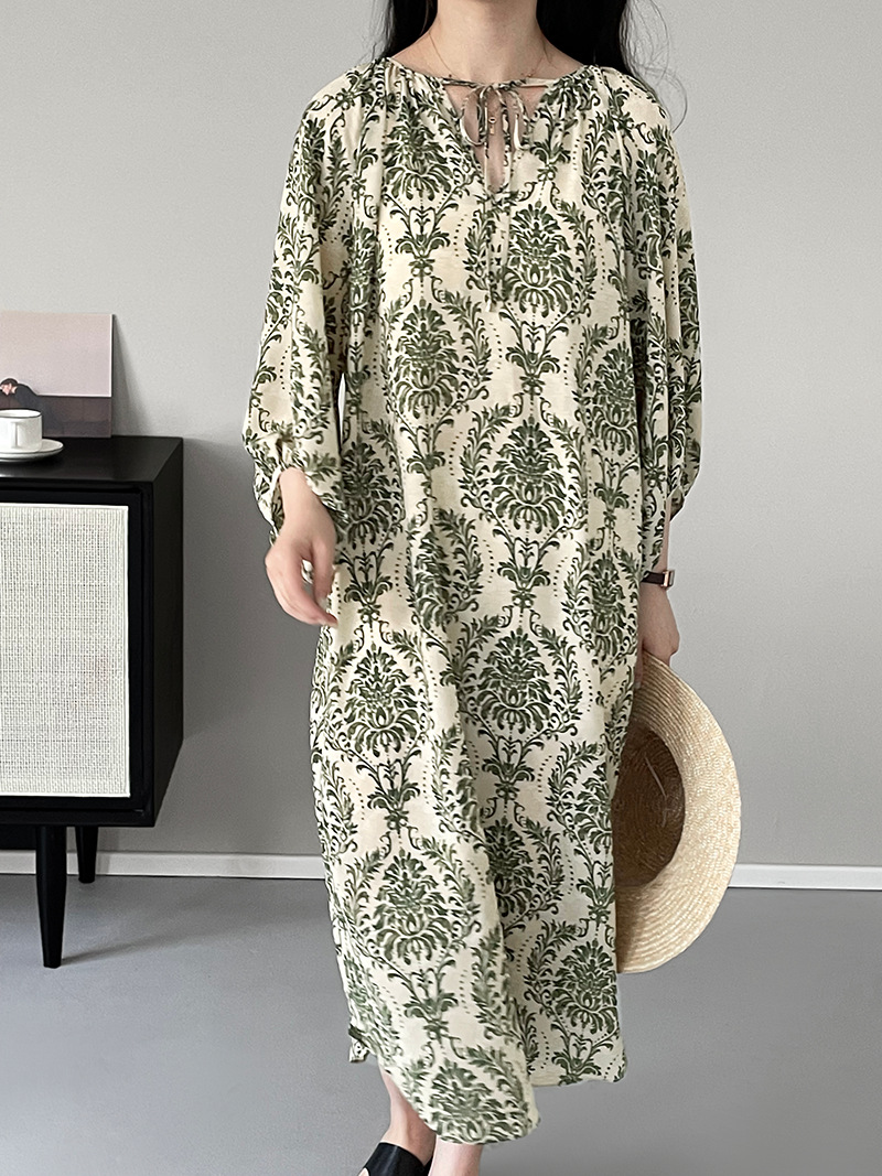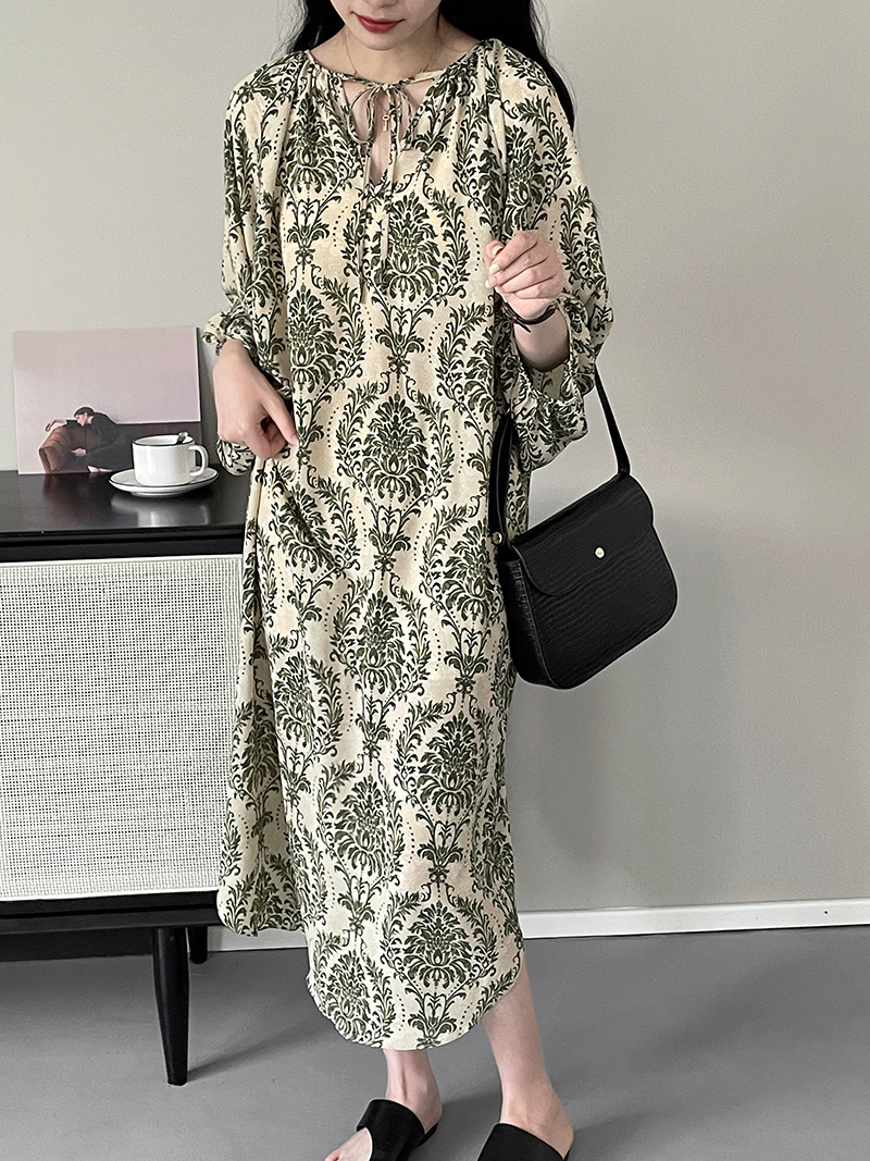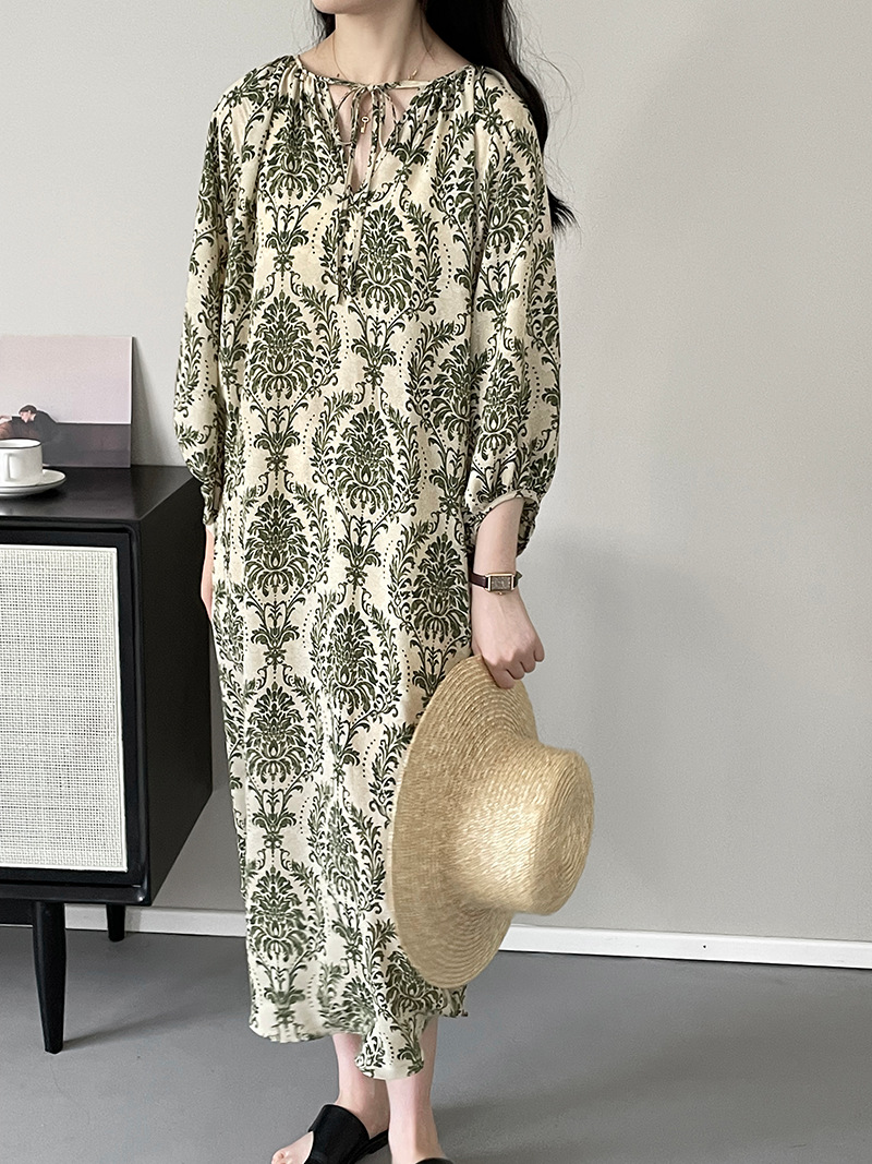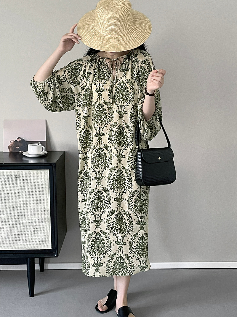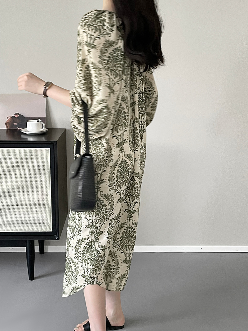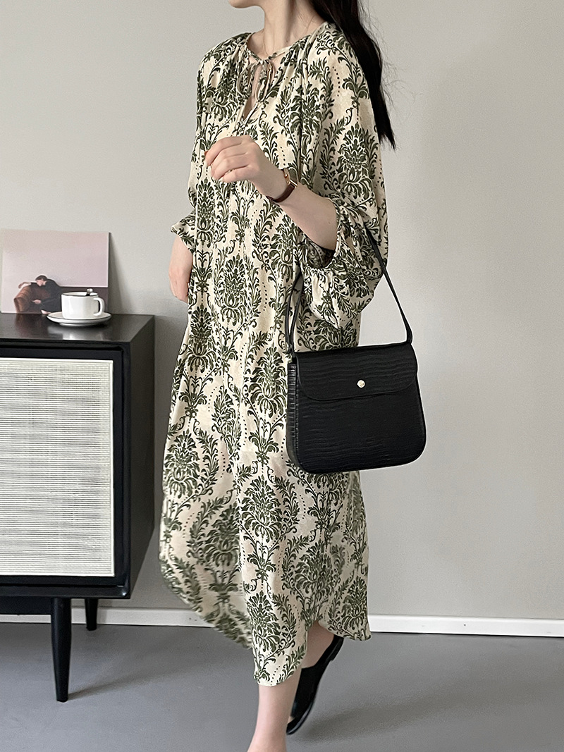 (48H出貨)復古綠碎花燈籠袖薄款連身裙
