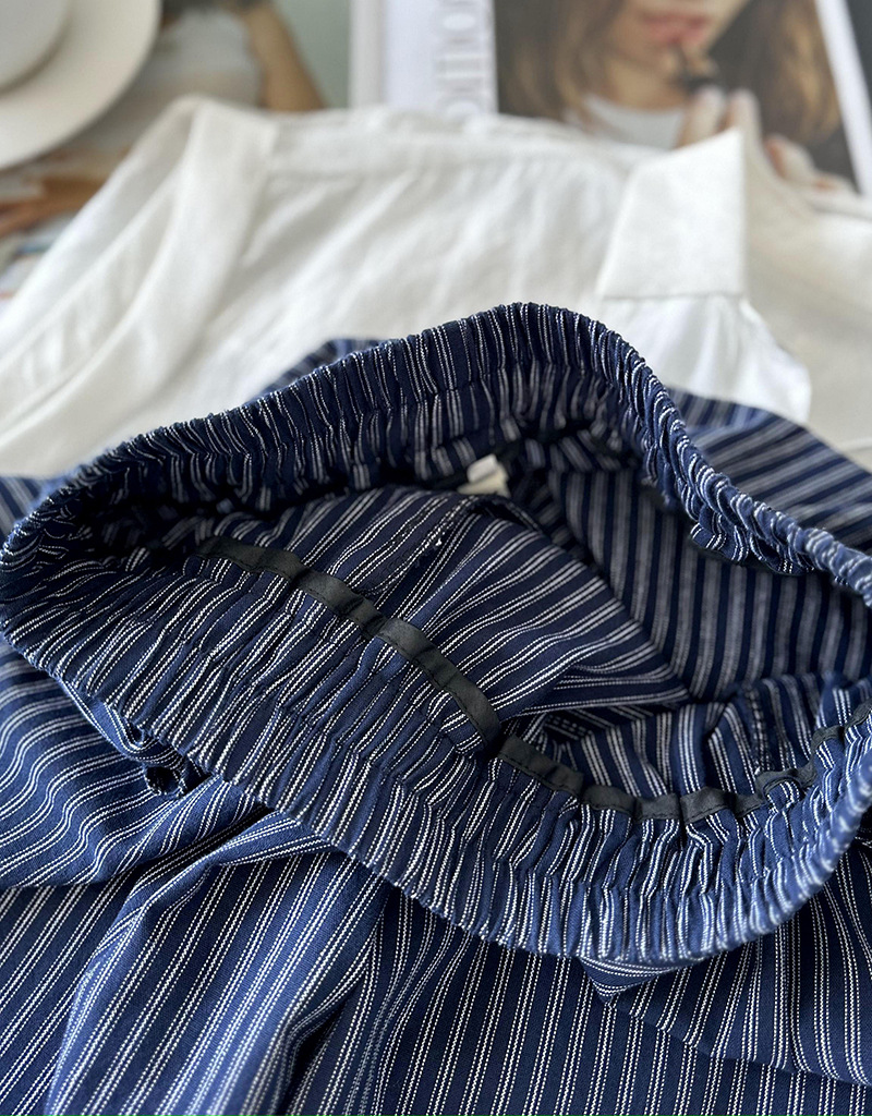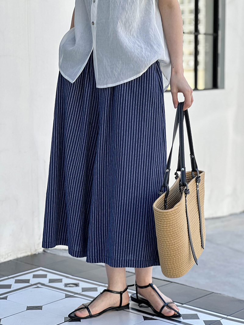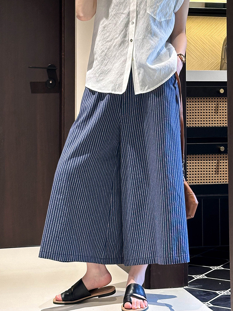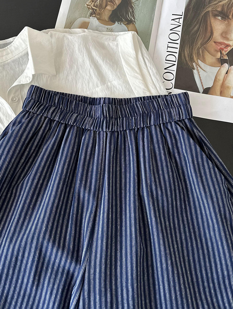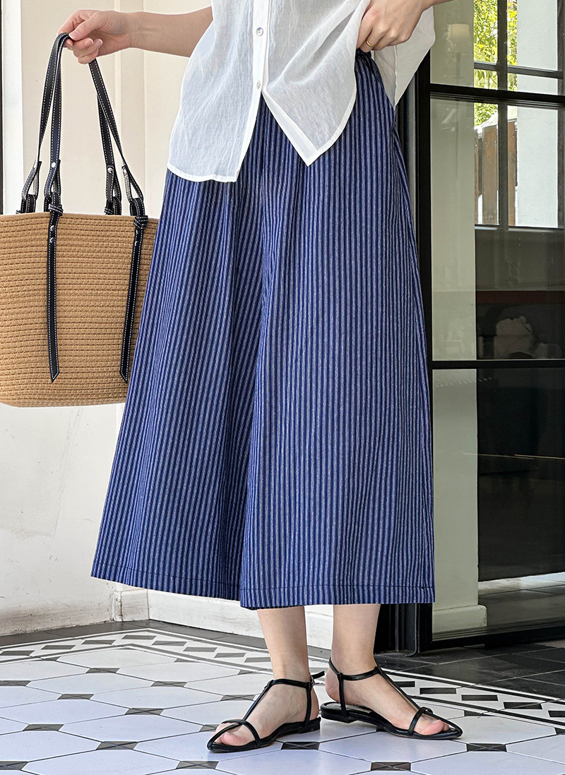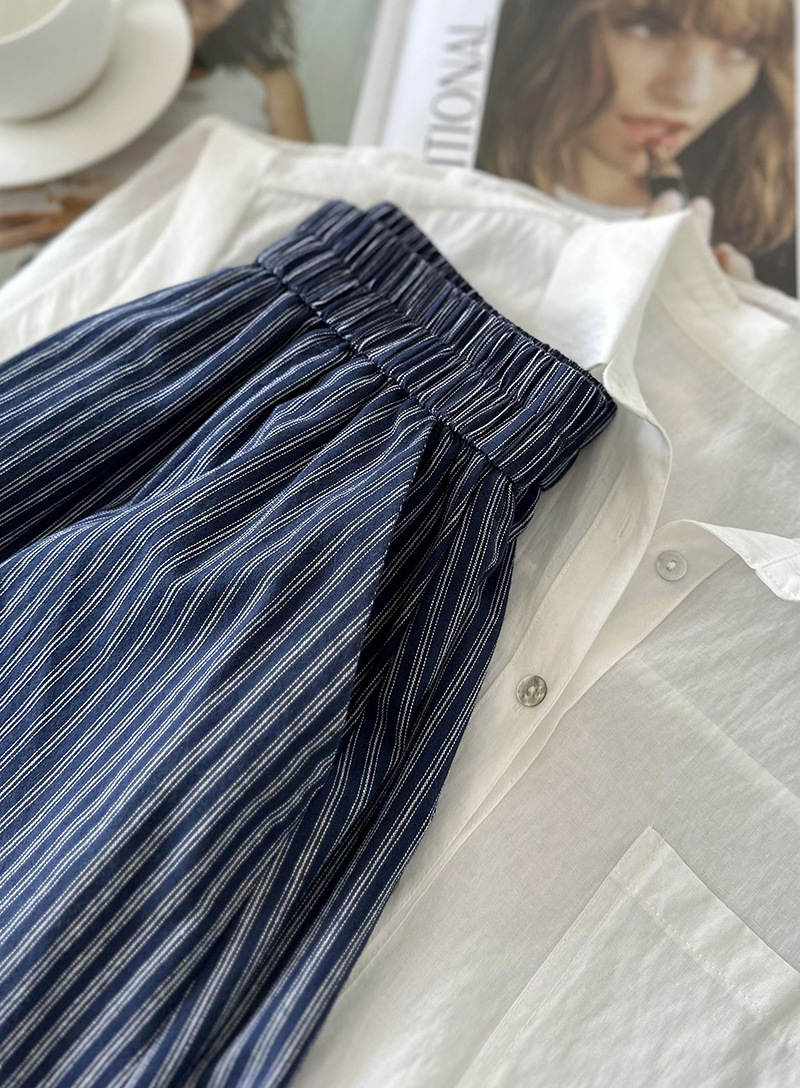 (48H出貨)日系條紋鬆緊高腰寬鬆度假風裙褲