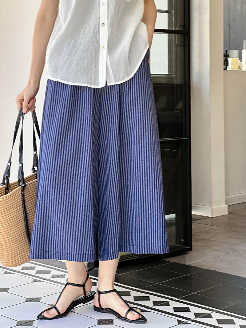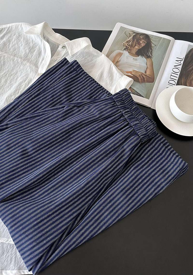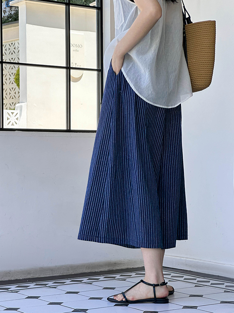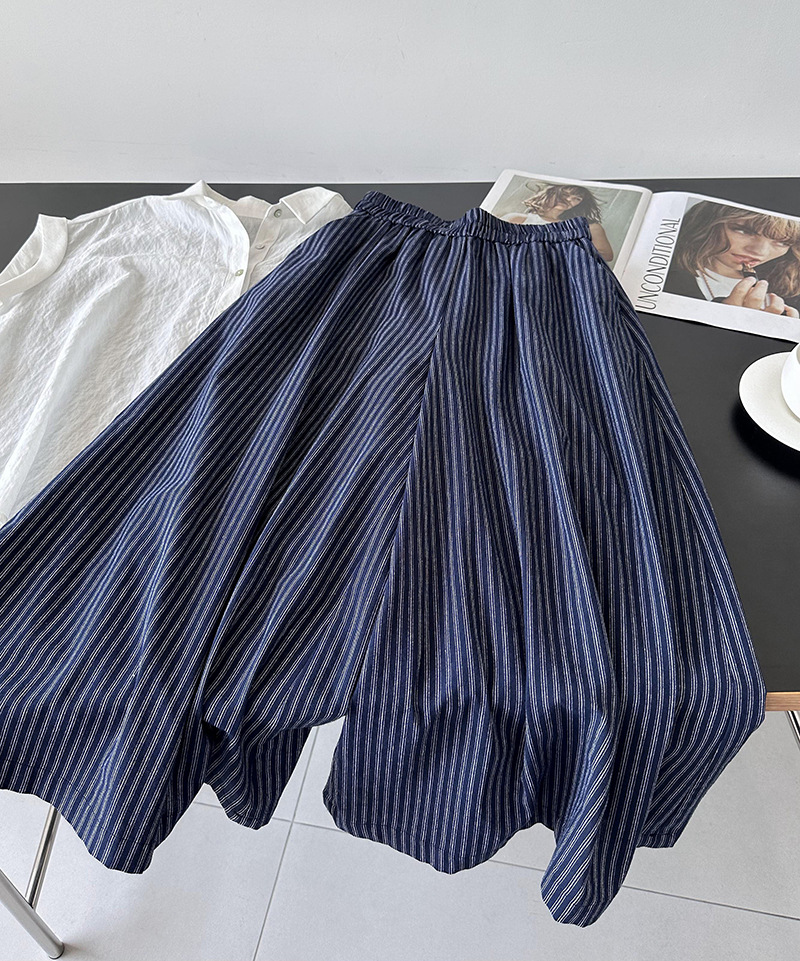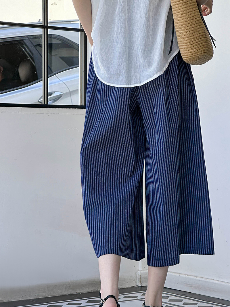 (48H出貨)日系條紋鬆緊高腰寬鬆度假風裙褲