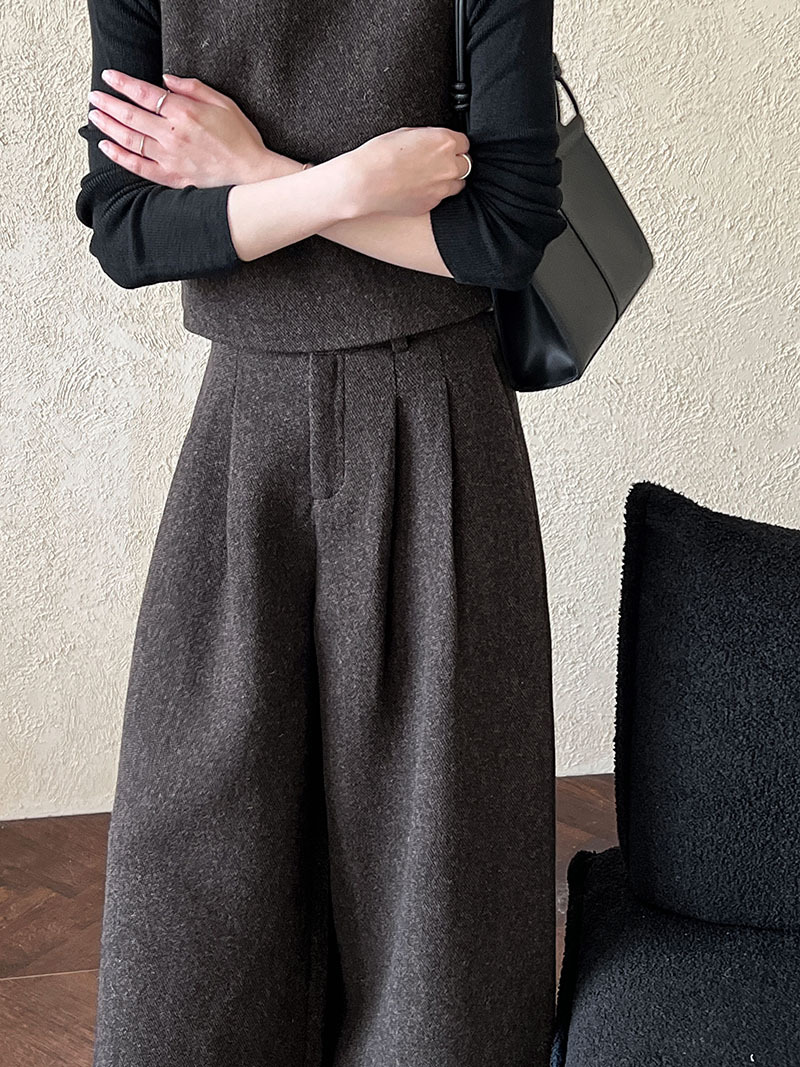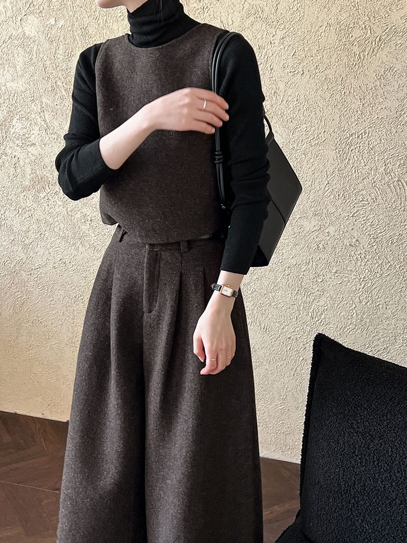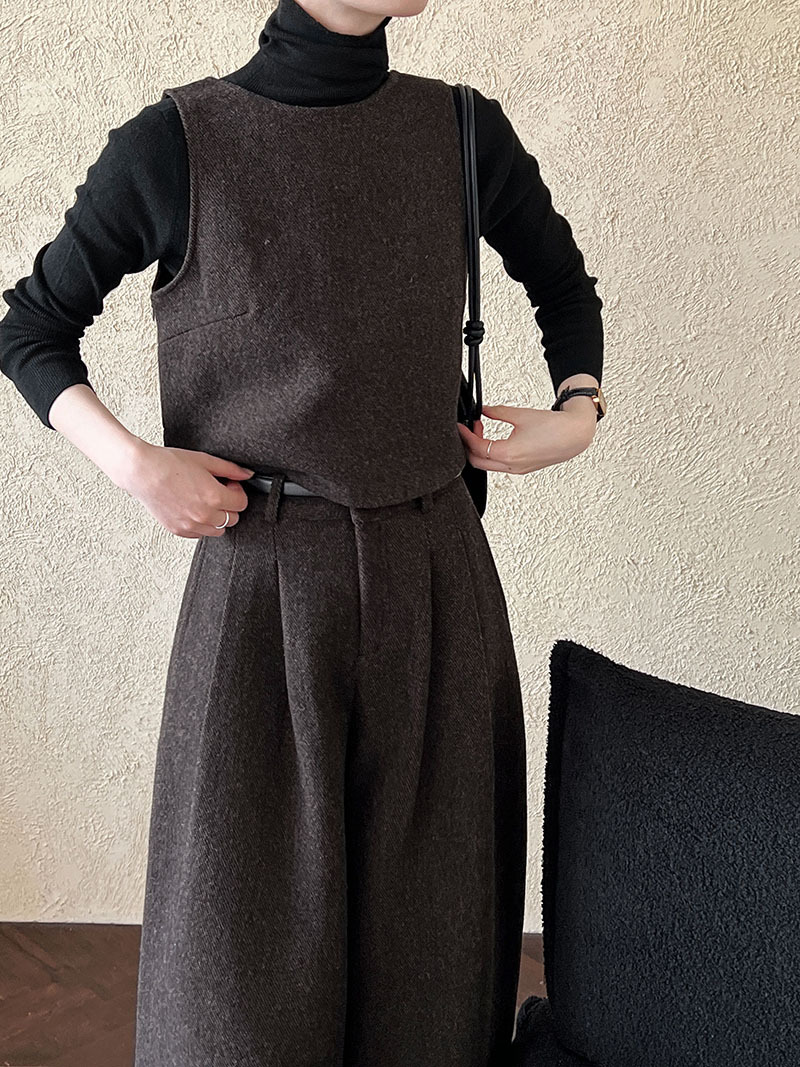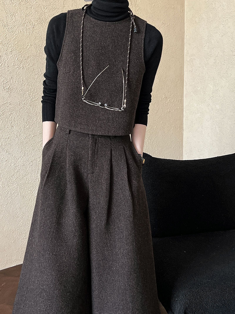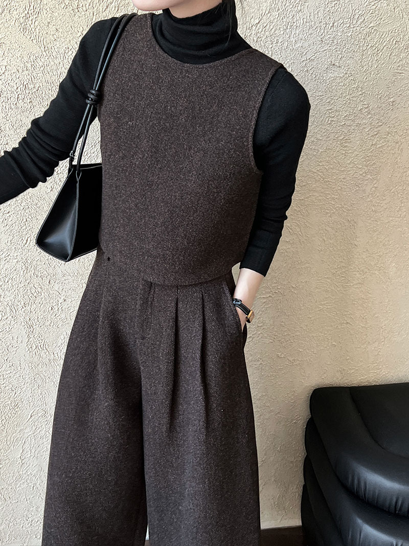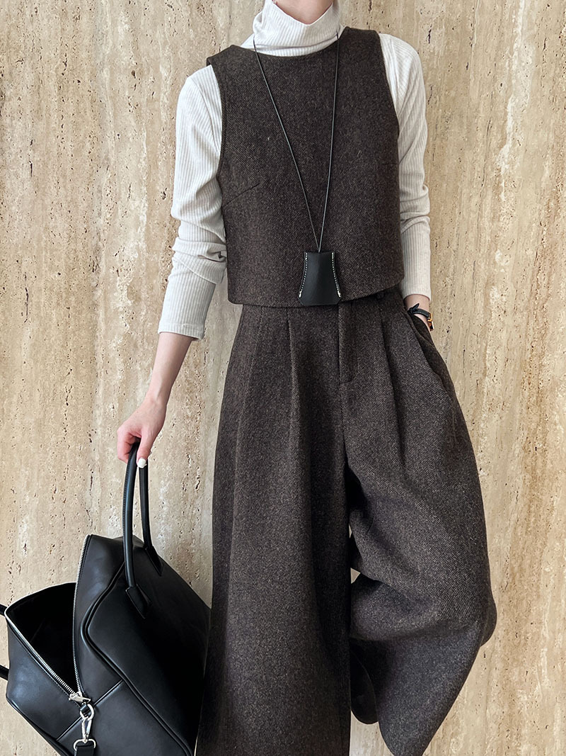 (48H出貨)羊毛呢高級感兩穿馬甲+闊腿西裝褲兩件式套裝-2色