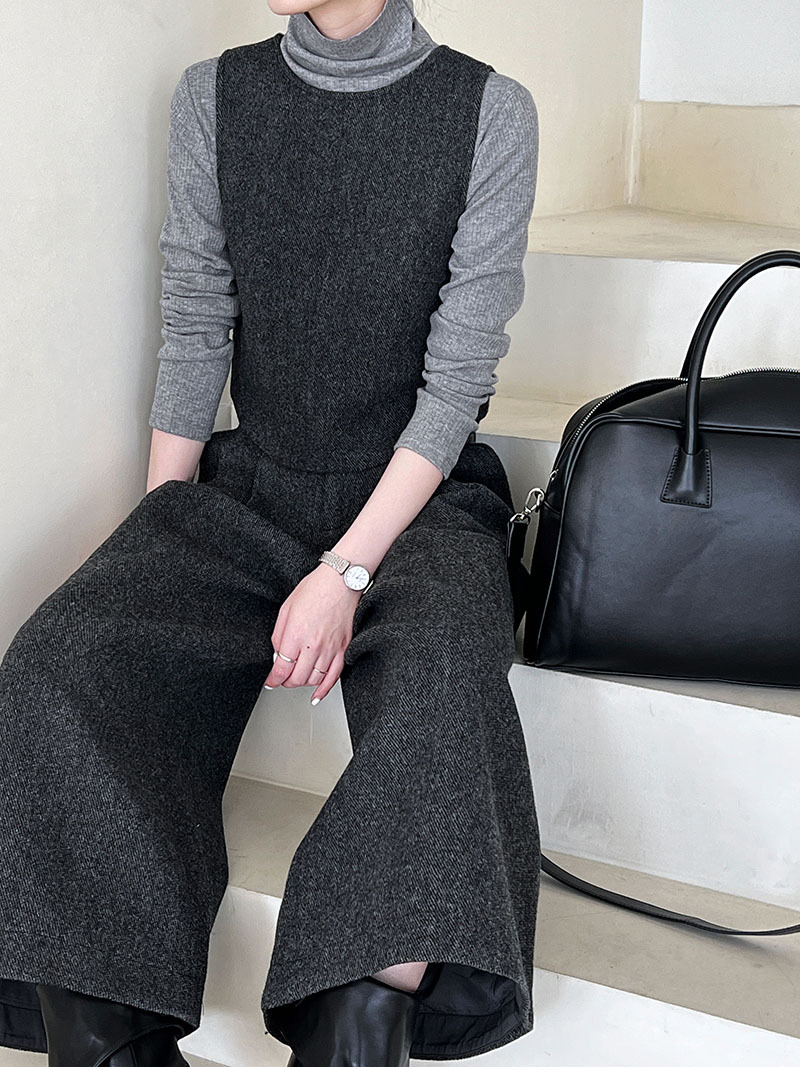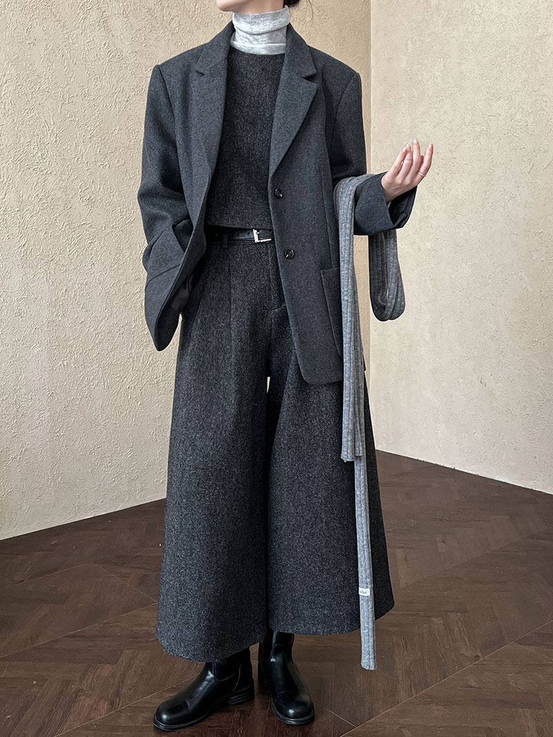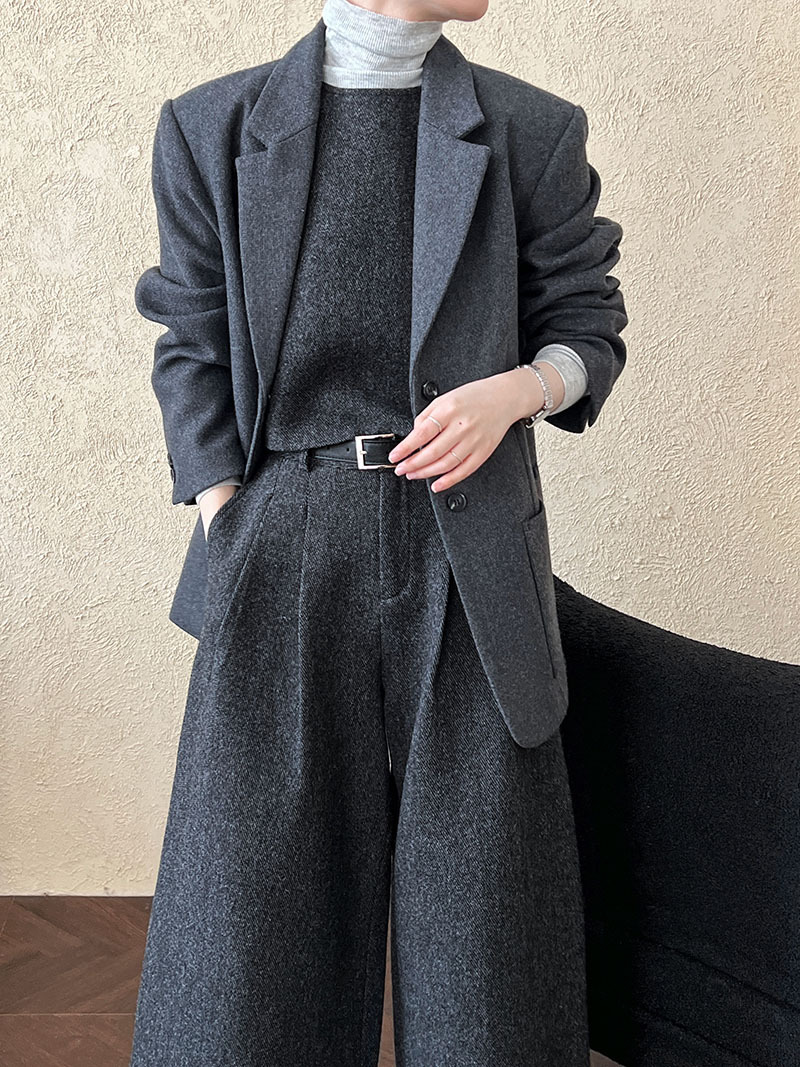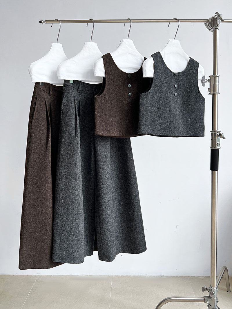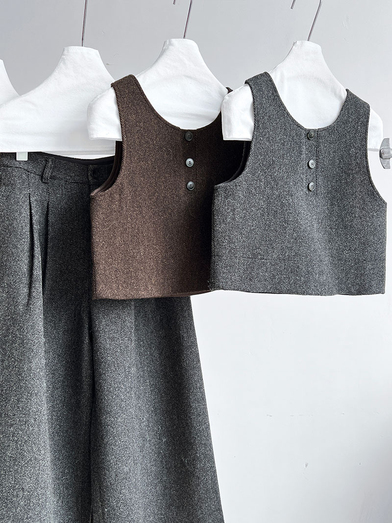 (48H出貨)羊毛呢高級感兩穿馬甲+闊腿西裝褲兩件式套裝-2色