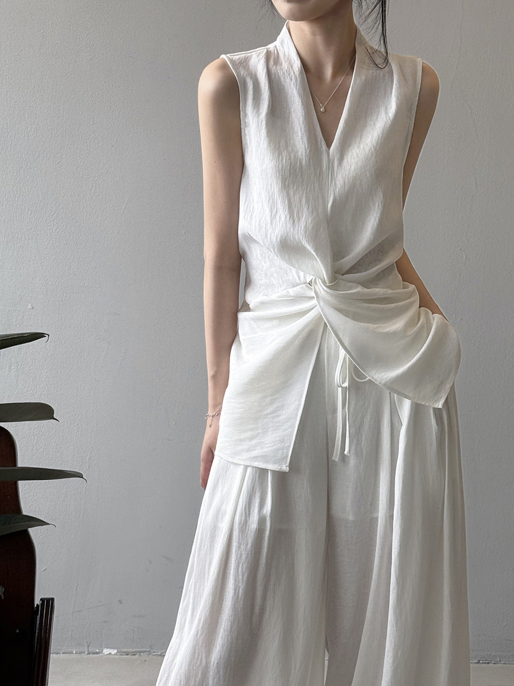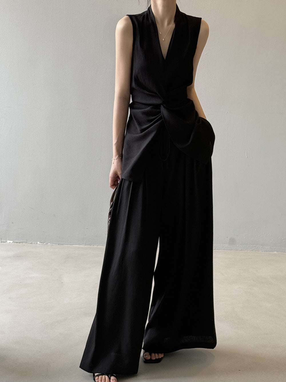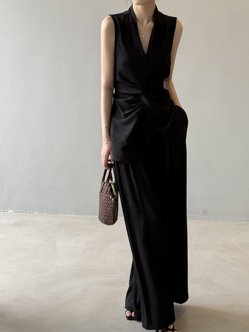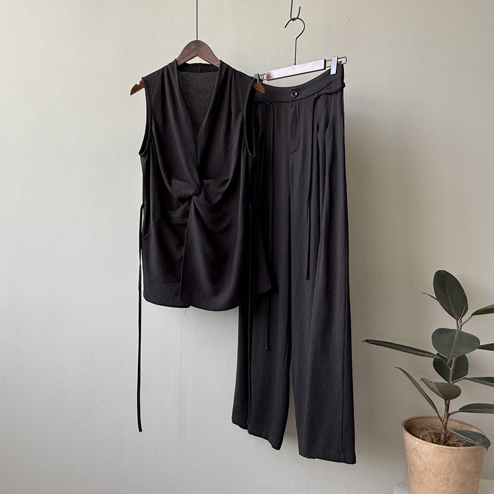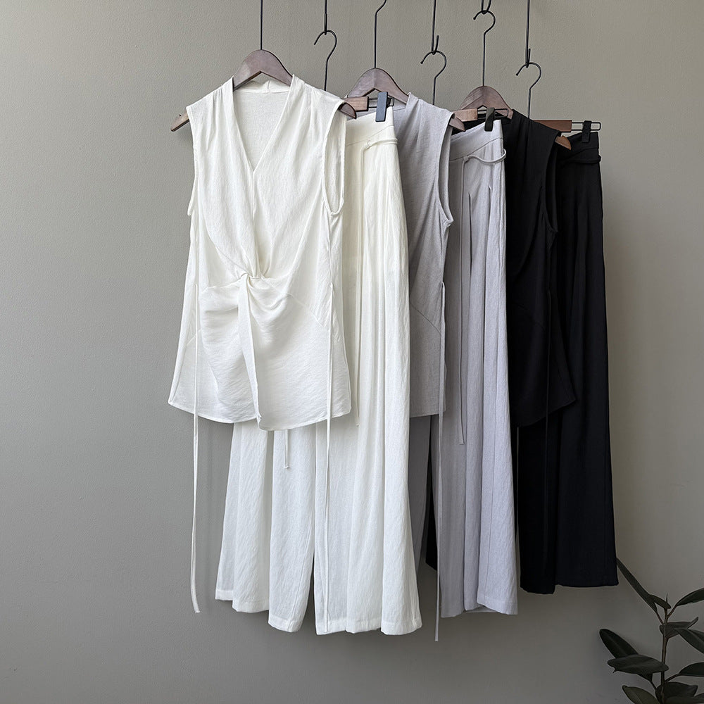(48H出貨)質感設計扭結無袖襯衫+闊腿長褲-兩件式套裝-3色