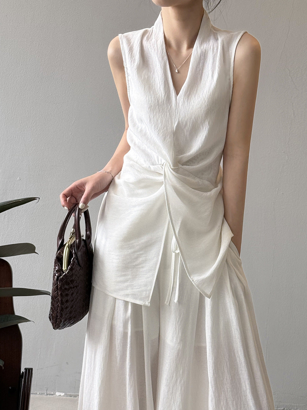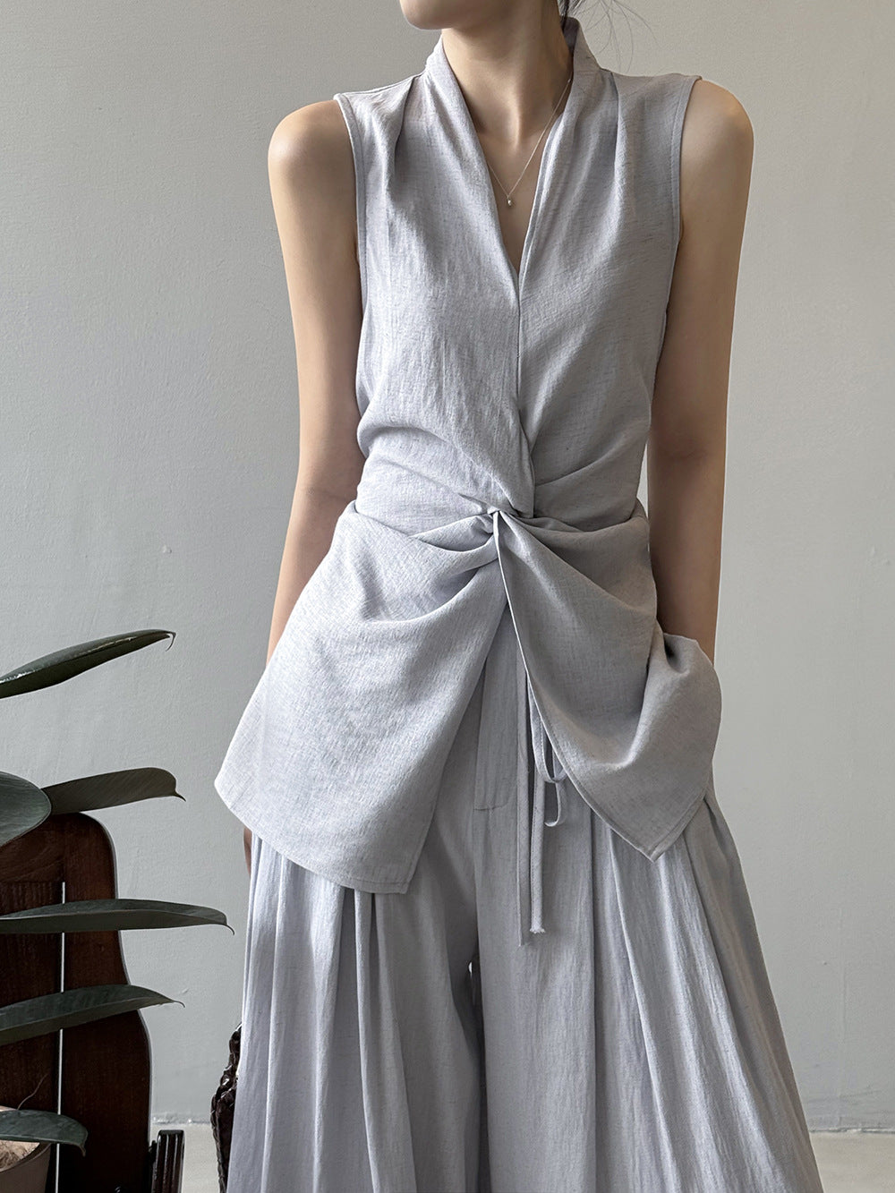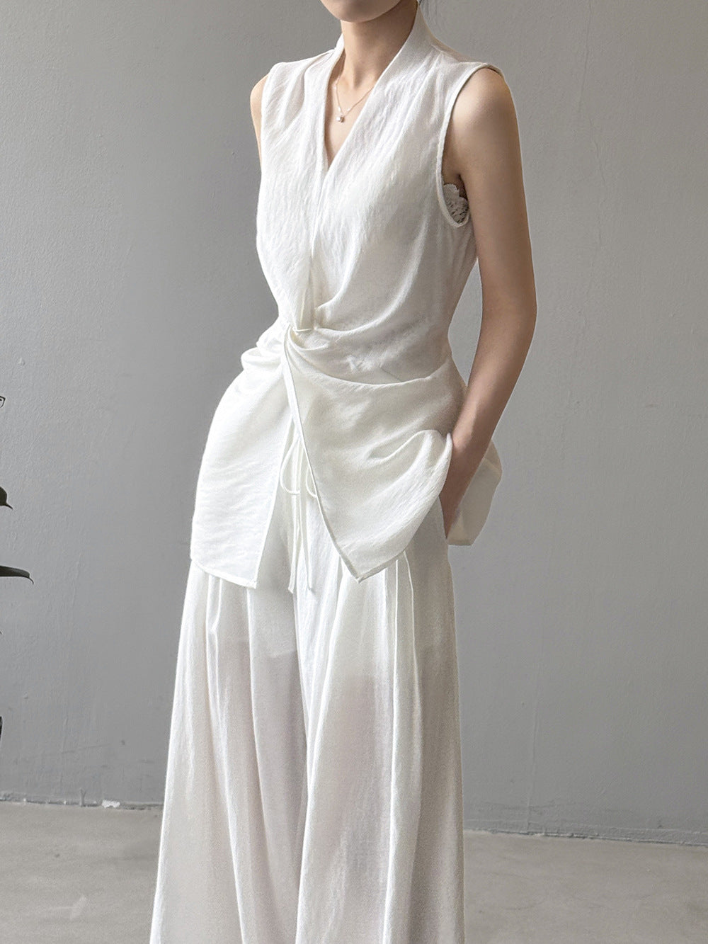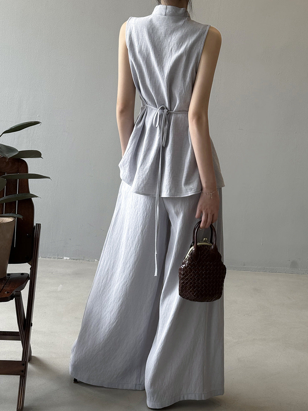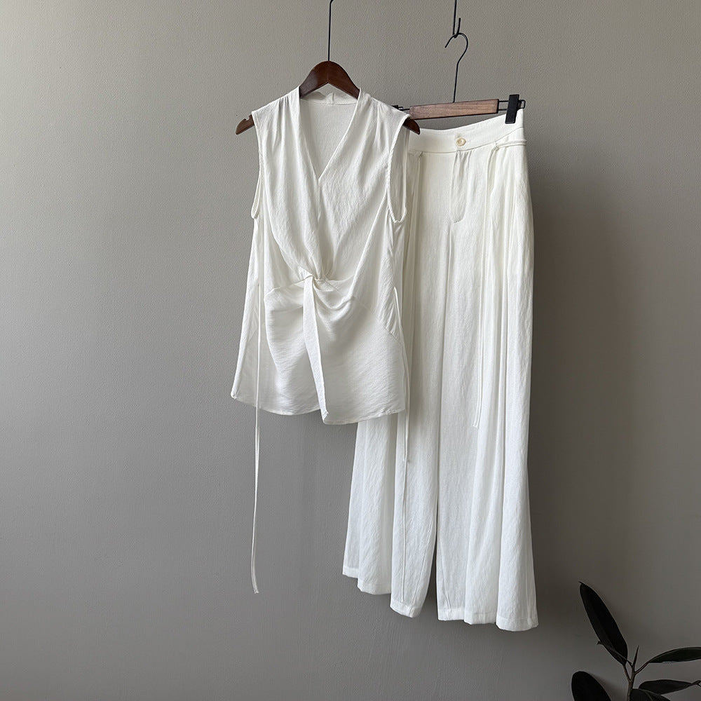 (48H出貨)質感設計扭結無袖襯衫+闊腿長褲-兩件式套裝-3色