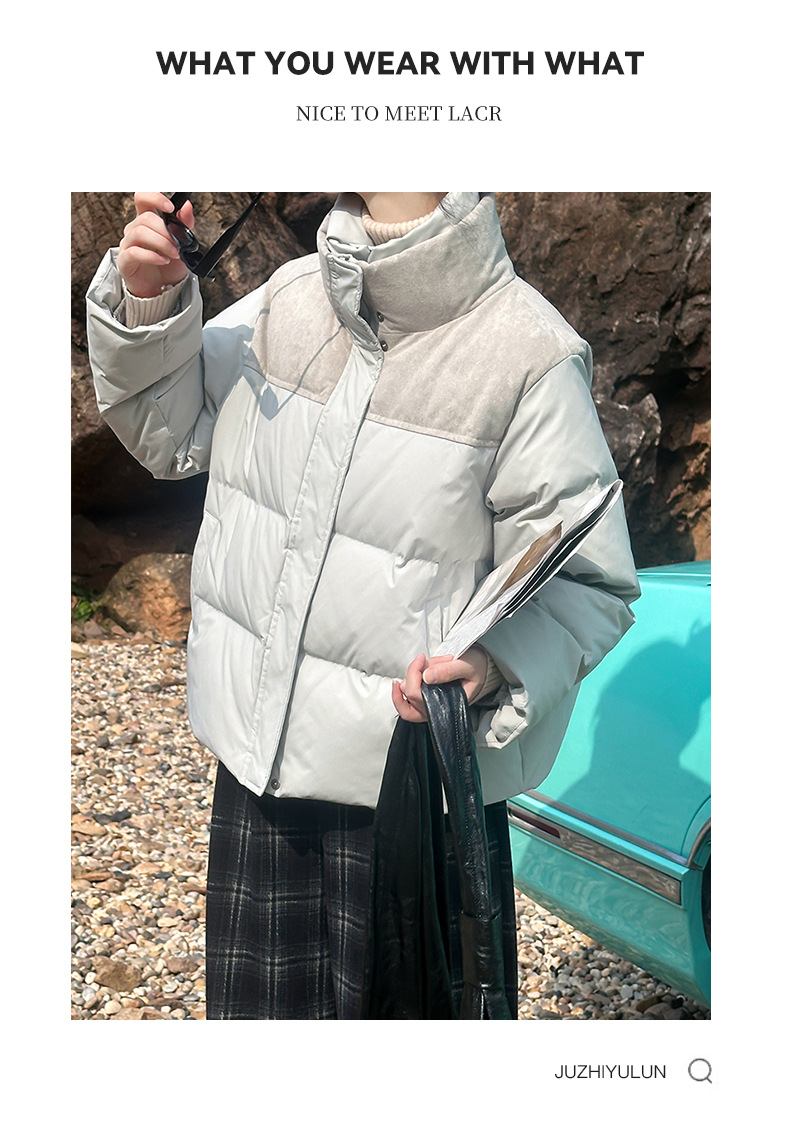 (48H出貨)韓系純色拼接立領保暖白鴨絨外套