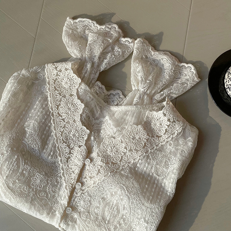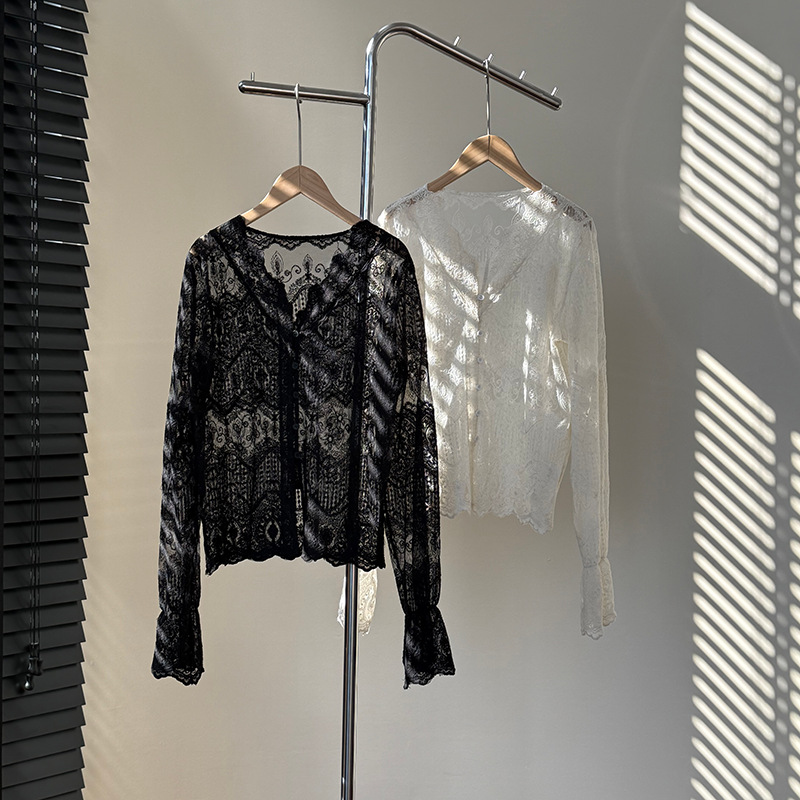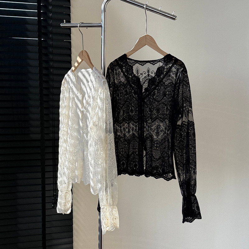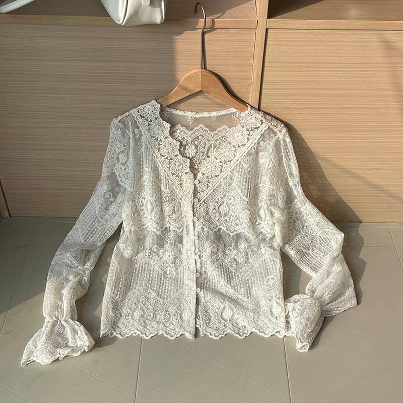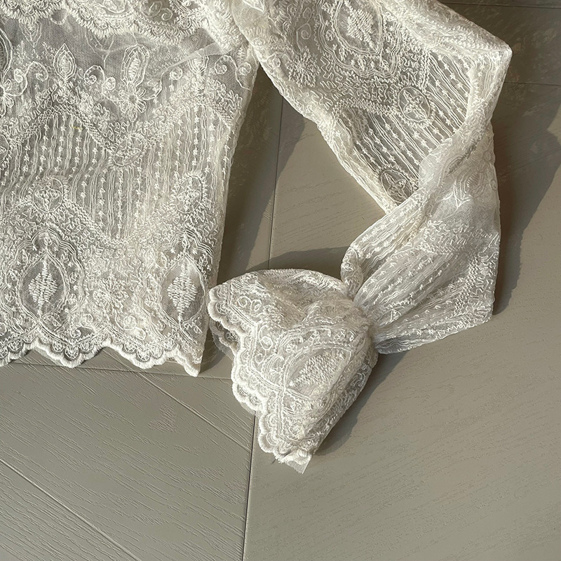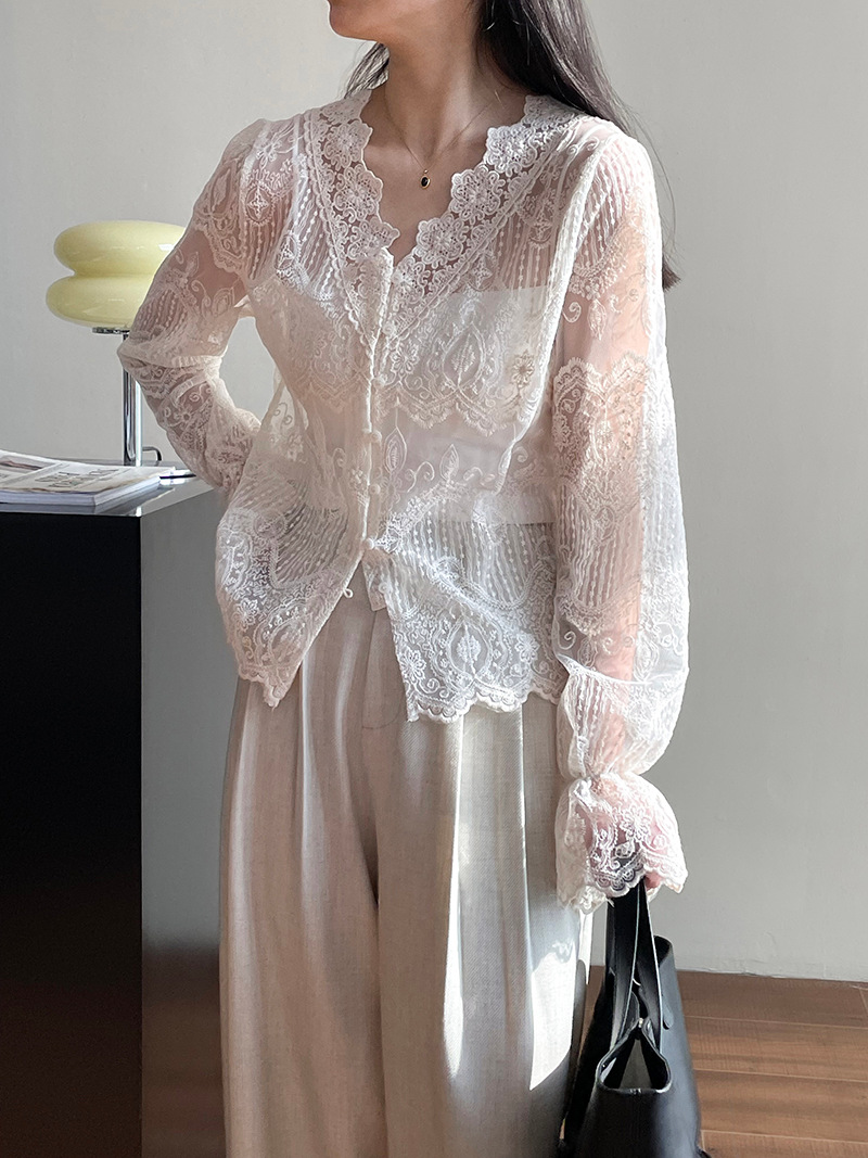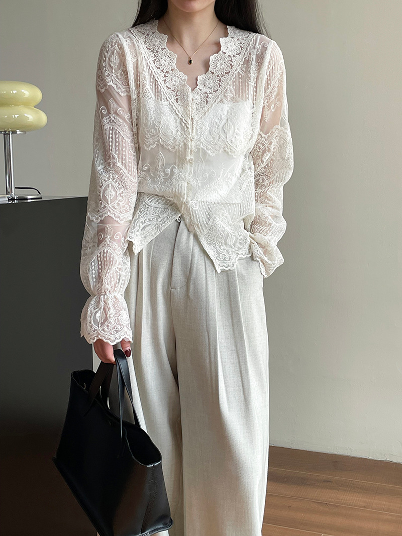 (48H出貨)V領蕾絲法式高級刺繡長袖襯衫-2色
